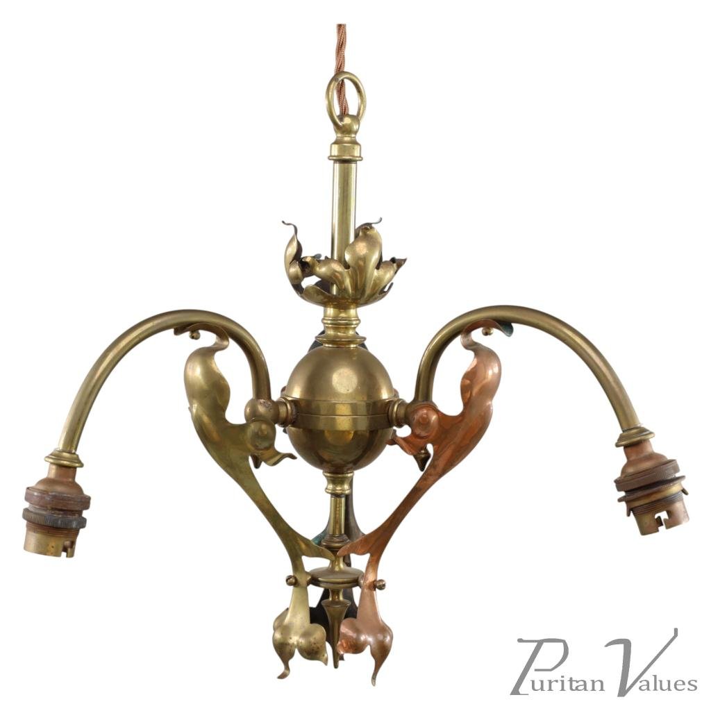 An Arts and Crafts brass three arm ceiling light