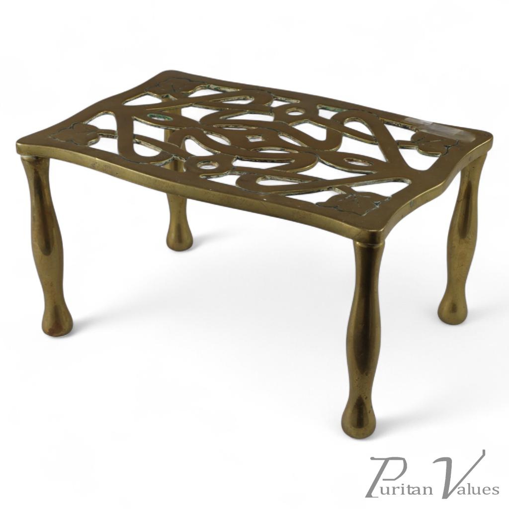A brass trivet, Arts and Crafts movement, c.1900. Rectangular pierced top with floral design and shaped legs, typical of English domestic metalwork.