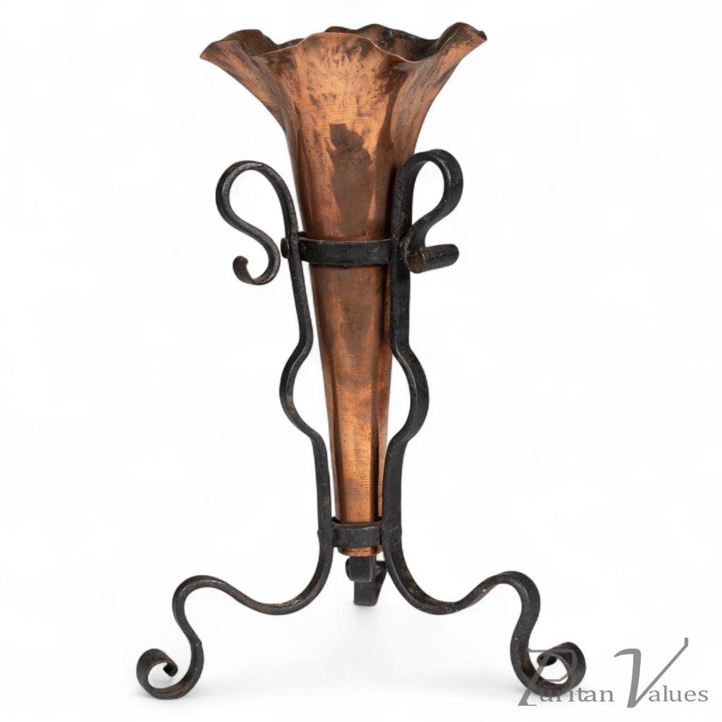 This exquisite piece showcases the craftsmanship of the Arts and Crafts movement. The combination of copper and hand wrought iron creates a striking visual appeal. Its conical shape is both functional and decorative, making it a perfect addition to any floral arrangement. The attention to detail in the design reflects the values of the era, emphasizing handmade quality and natural materials.