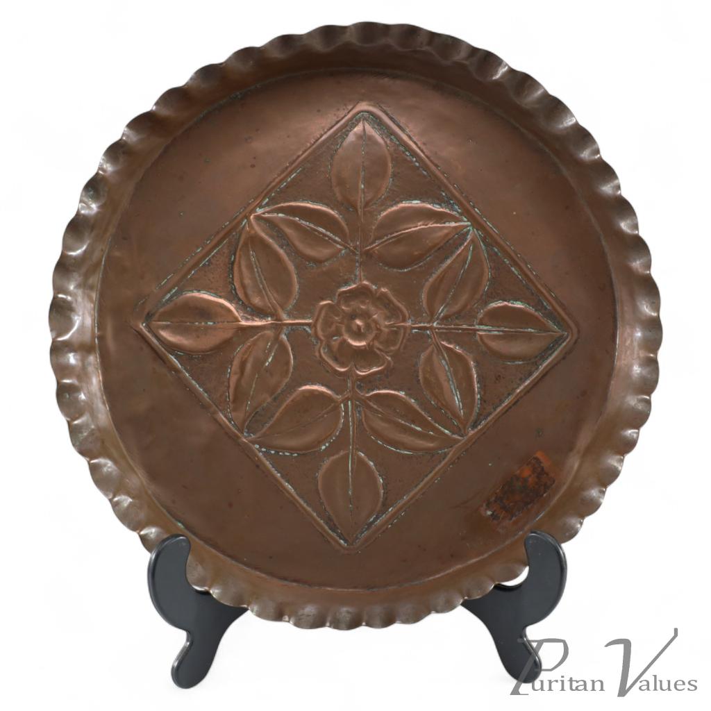 This Arts and Crafts copper plate was produced around 1900 and reflects the Arts and Crafts movement (1880–1910), with its commitment to handcrafted metalwork and natural motifs. The circular form features a pie-crust edge enclosing a repoussé floral design framed within a diamond border, executed with clarity and restraint.