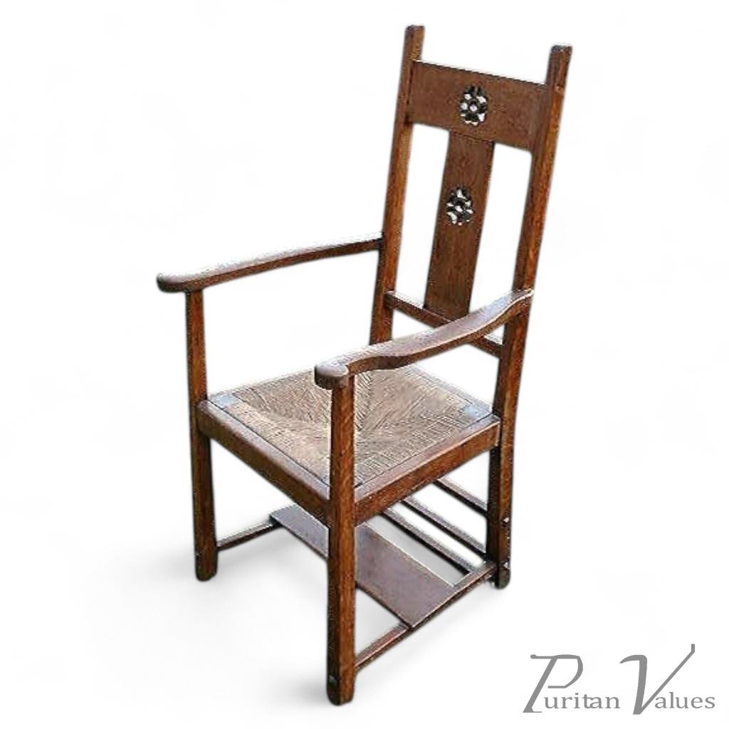 An Arts and Crafts Cotswold School armchair with lower shelf and pierced floral detail and exposed tennons. Circa 1900.
