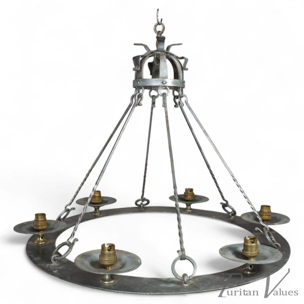 An Arts and Crafts Cotswold School hand wrought iron circular chandelier