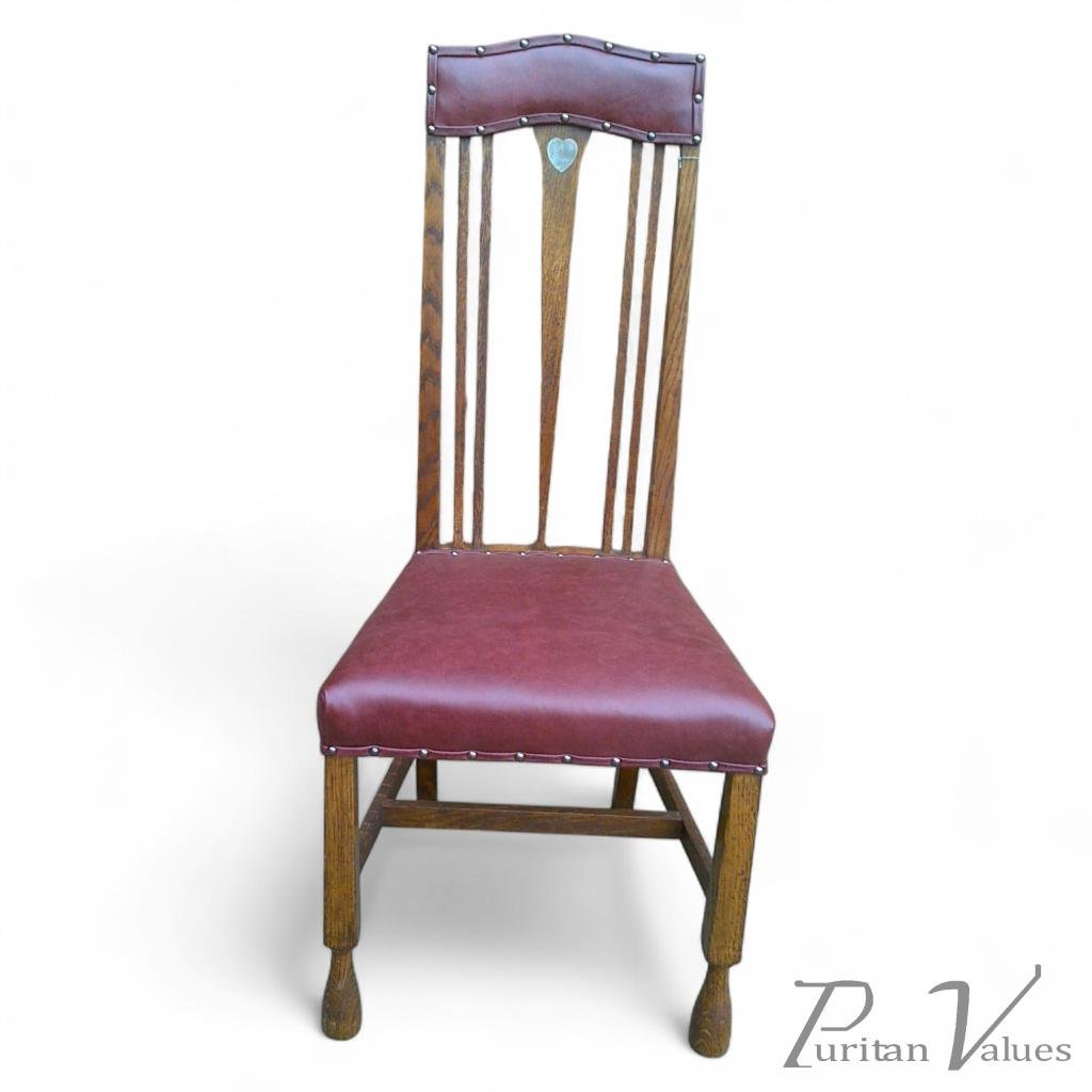 An Arts and Crafts oak chair with shaped padded head rest and a single pewter heart, professionaly upholstered in a quality leather. Circa 1905.