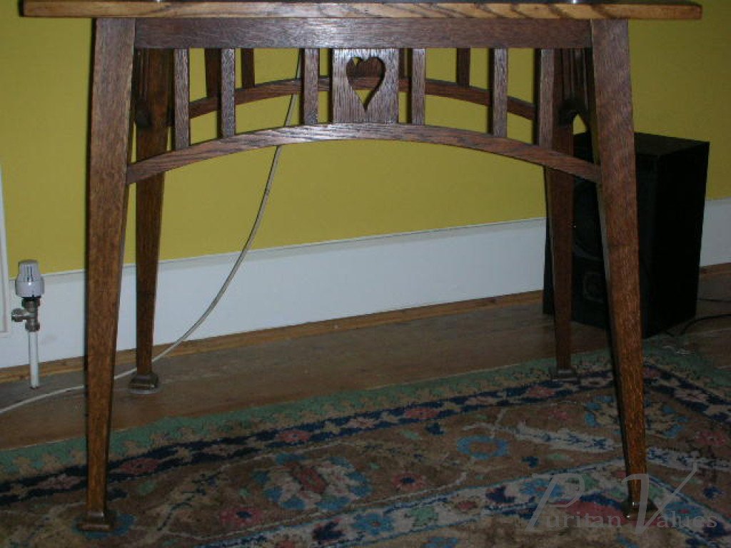 An Arts and Crafts oak table with sweeping slatted undertier pierced with a central heart to each side on square tapering angled legs.