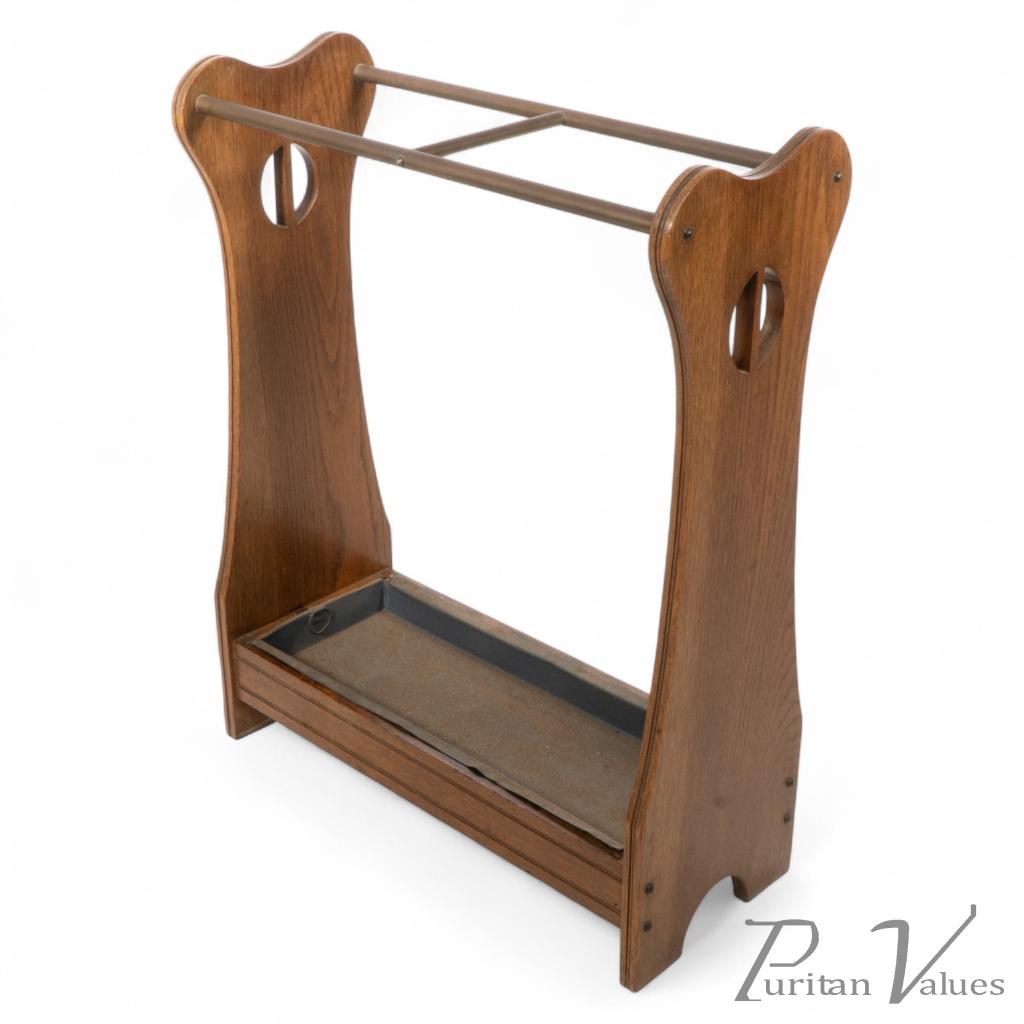 Umbrella and stick stand in oak, aligned to the Arts & Crafts Movement, c.1910. Elegantly contoured end panels with circular piercings support twin brass division rails that separate canes and umbrellas. The open sides keep the profile light while the fitted drip tray protects floors and makes the piece practical for daily use. Quietly functional and decorative, the form suits a townhouse entrance, country house boot room or compact vestibule.