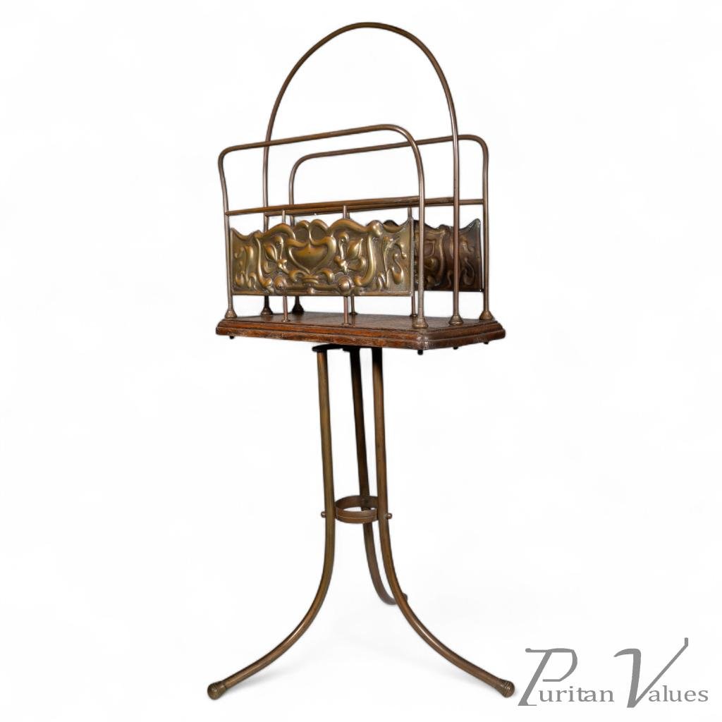 Revolving magazine rack in brass and oak by Townshends Birmingham Brassfounders, from the Arts and Crafts movement (1880–1910), c.1900. The design incorporates a rectangular basket with pierced and repousséd brass panels set above an oak platform, supported on a rotating tripod stand with scrolled legs.
