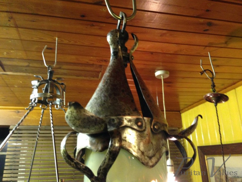 An Arts and Crafts silver plated lantern with floral Vaseline shade.