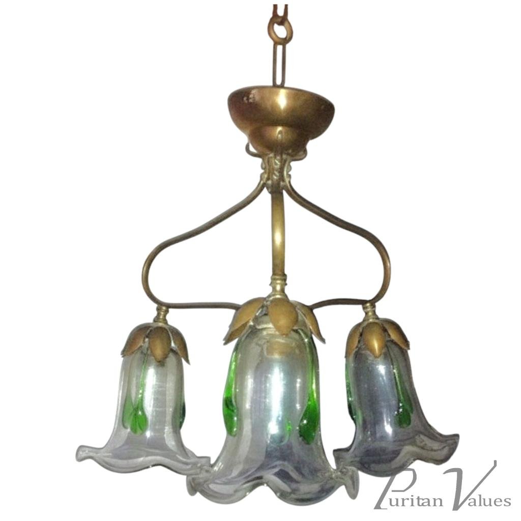 Arts and Crafts Three Branch Brass Ceiling Light with Petal Fitters
