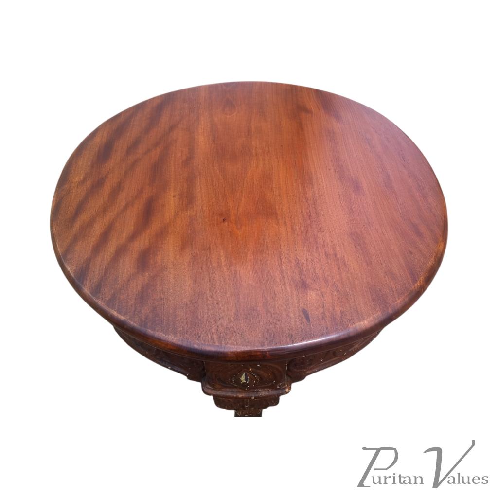 with a solid walnut top, stylised floral details to the skirt and upper legs which are united by a stylised spoked wheel stretcher with lions paw feet which can be screwed to the floor. This table is for inside or outside use.