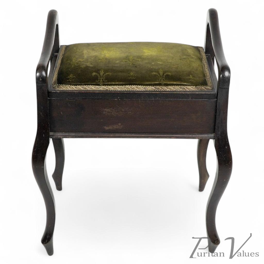 An Edwardian stained Beech piano stool with curvacious upper arms and legs, period green fabric printed with fleur de lys and storage below the seat. Circa 1910.