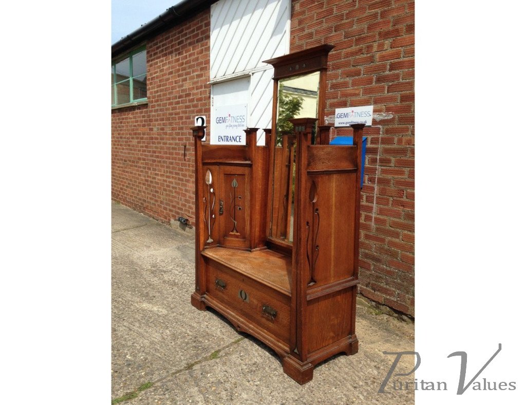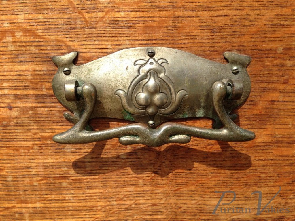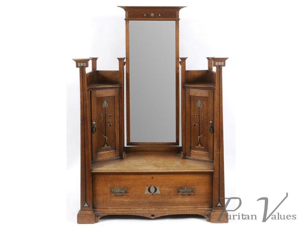 An impressive Arts and Crafts oak dressing table with pewter and ebony stylised floral inlays.