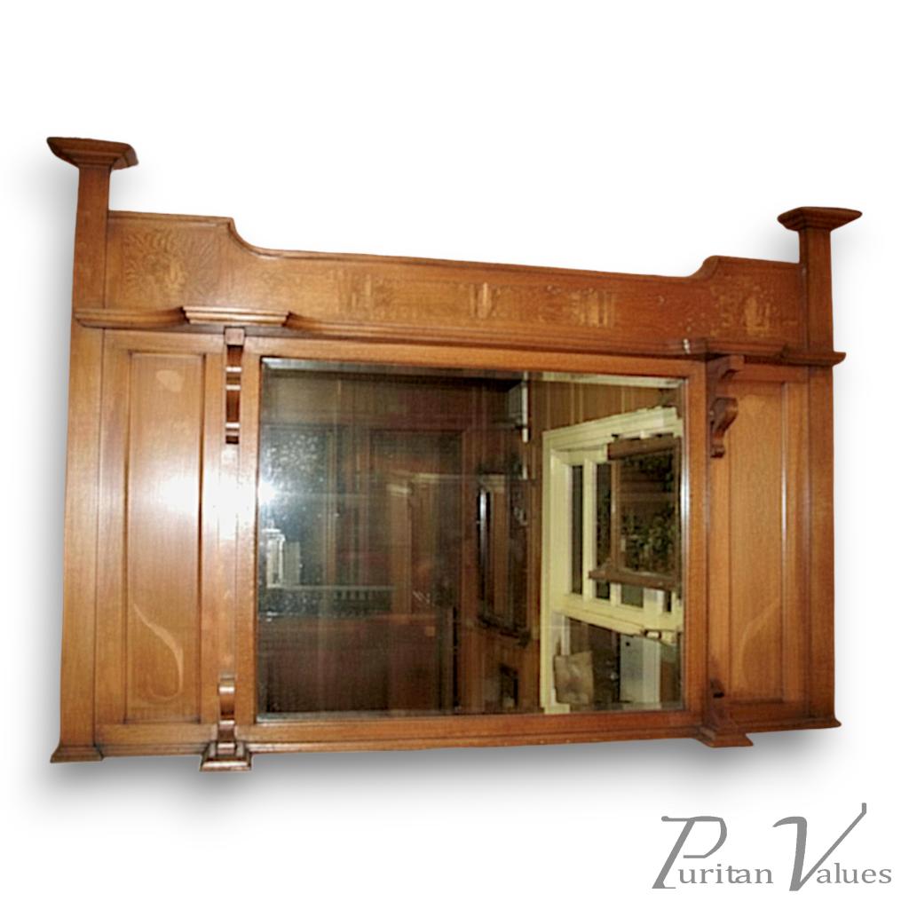 An oak overmantel dating to c.1900, designed in the Arts and Crafts Movement style. The frame is constructed in solid quarter-sawn oak with a central bevelled mirror flanked by panelled uprights and an upper display shelf. Decorative floral inlay enriches the frieze, demonstrating fine cabinetmaking and the integration of natural motifs typical of the period. The piece reflects the Arts and Crafts commitment to craftsmanship and honest material expression within domestic architecture and interior design.
