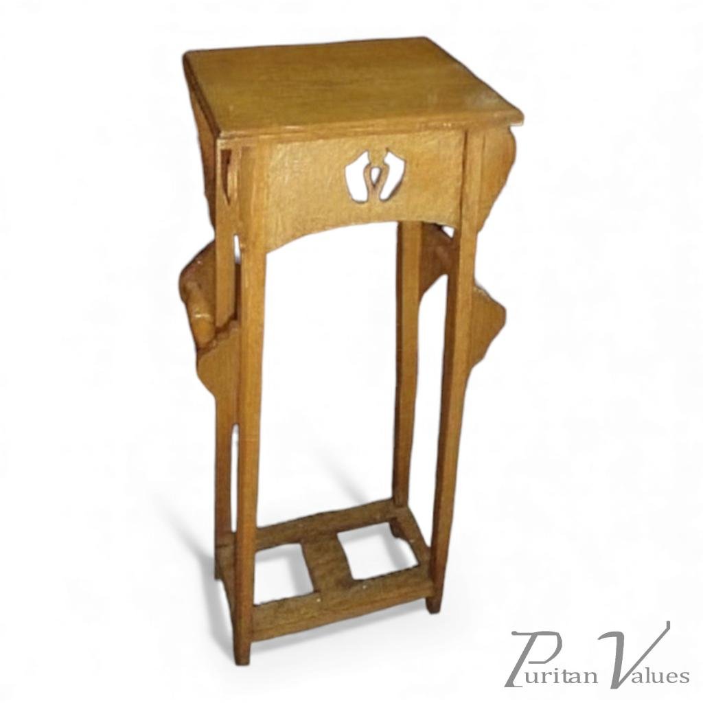A compact Arts and Crafts oak stick stand dating from around 1900. The rectangular frame is constructed in quarter-sawn oak, with a pierced heart motif to the upper frieze and shaped side supports that project subtly beyond the uprights. Below, the open base would once have held a removable drip tray. The clean geometry, light tone and decorative cut-outs are typical of vernacular English craftsmanship influenced by the Guild of Handicraft and regional workshops around the turn of the century.