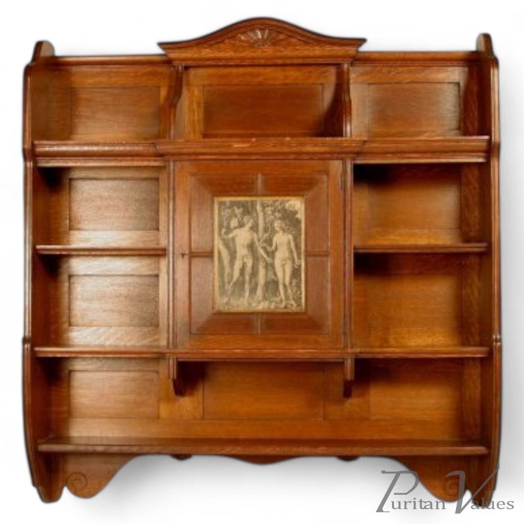 An oak hanging bookcase with open shelves placed around a central door, the door inset with a print of Adam and Eve after Albrecht Dürer, Height 46" 114cm , Width 43 109cm ", Depth 9" 22cm. Circa 1870's.