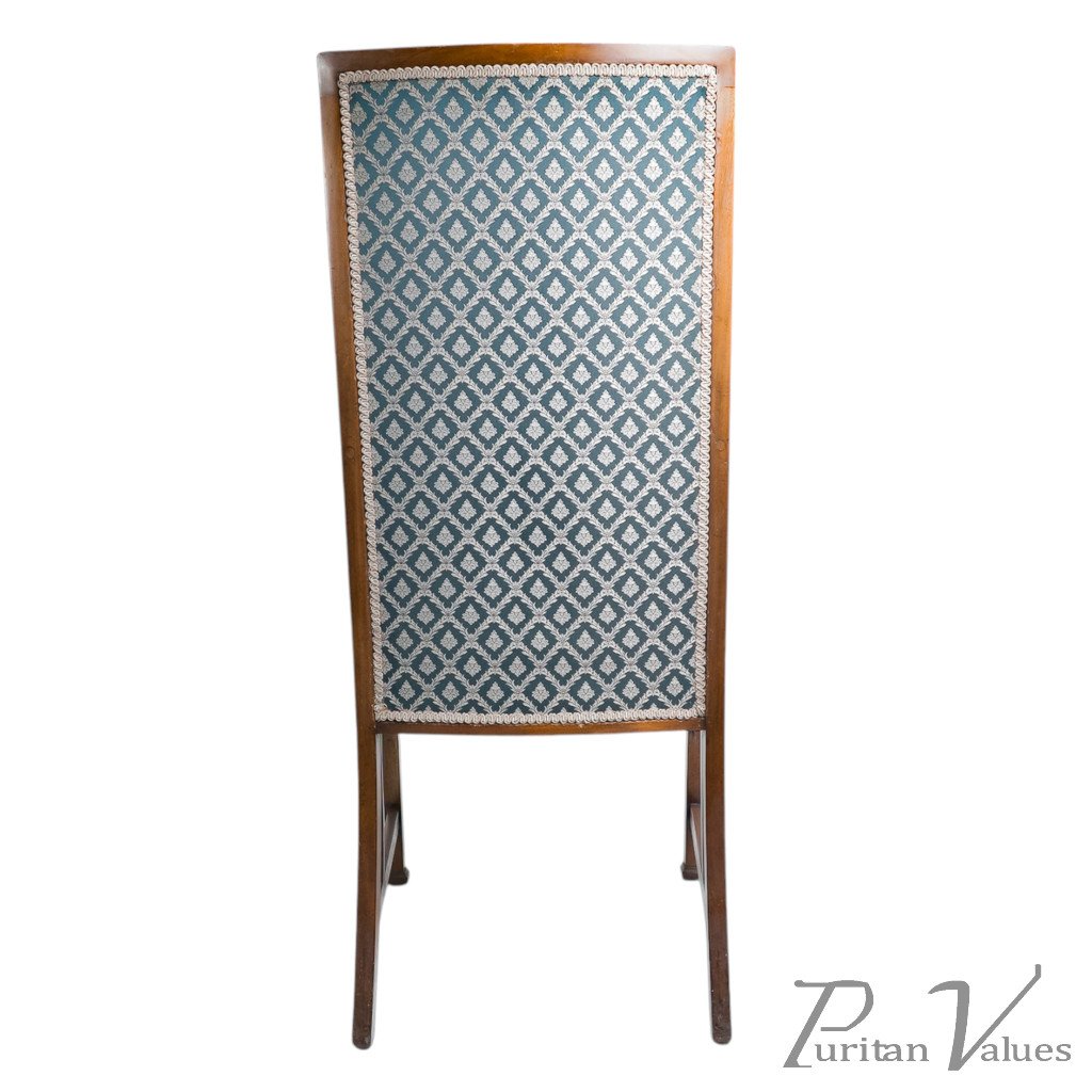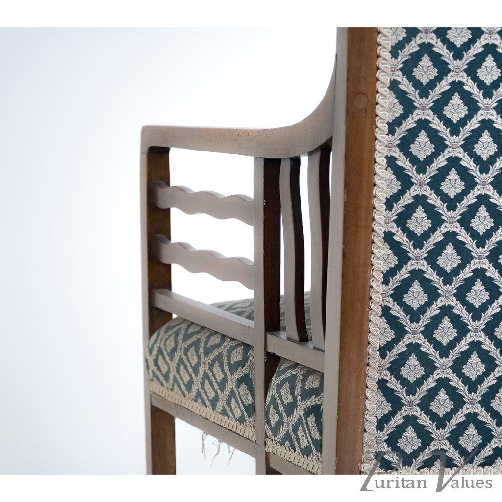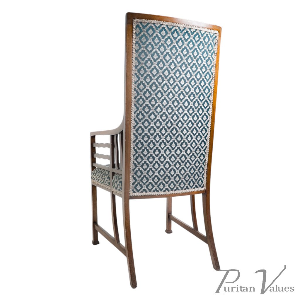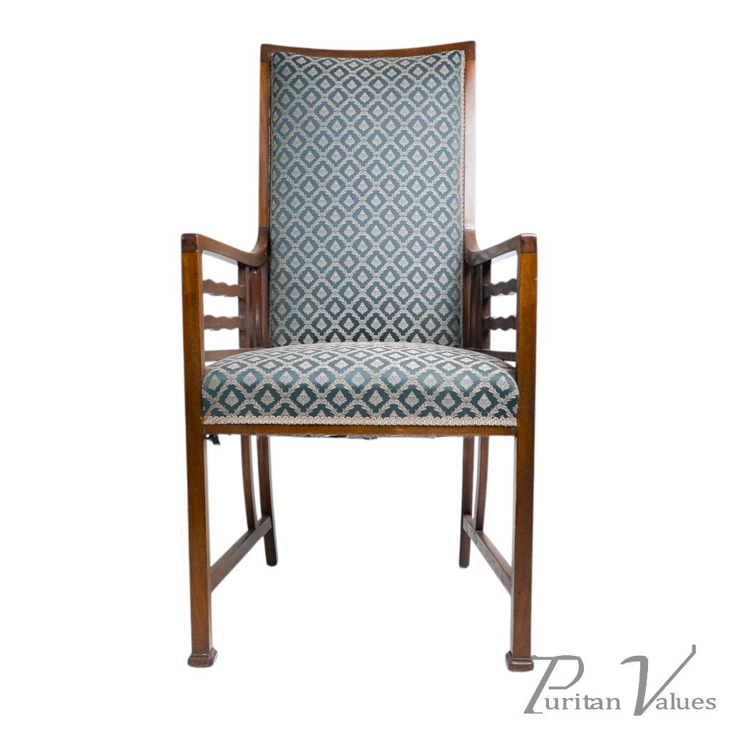By Liberty & Co (attributed), an Anglo-Japanese walnut armchair aligned to the Arts and Crafts movement (1880–1910), c.1900. The tall, gently raked back and square seat sit within a light walnut frame. Wavy arm supports continue through to the side stretchers, a hallmark of Anglo-Japanese line and construction, with plain square legs and simple rails that keep the emphasis on proportion. Upholstered back and seat in patterned fabric present cleanly.