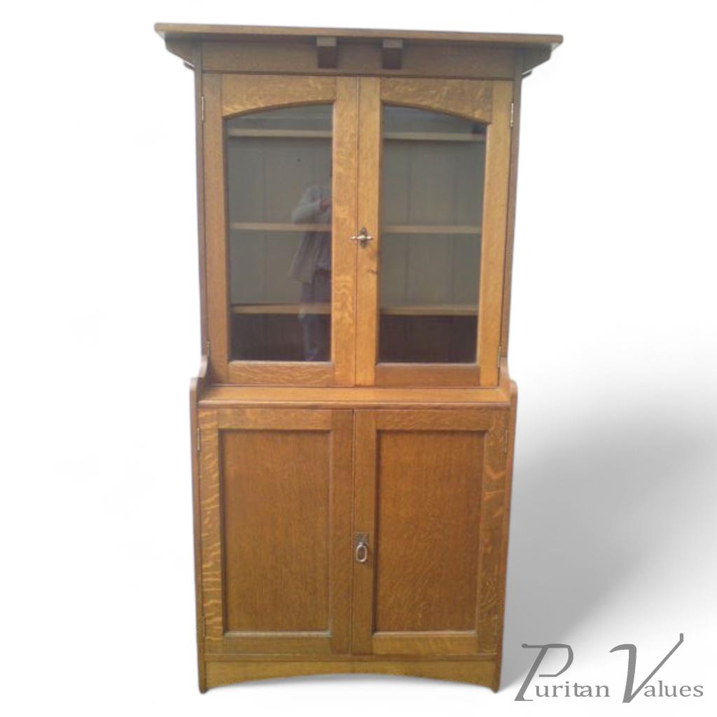 A good early Arts and Crafts oak bookcase with angled supports and arched tops to the glazed upper doors with sophisticated tounge and groove dust barriers around the entire edges of both doors and sweeping detail to the lower front. Attributed to Arthur Simpson of Kendal. Stamped with 6933 to the upper back in the same way as The Simpson's of Kendal.