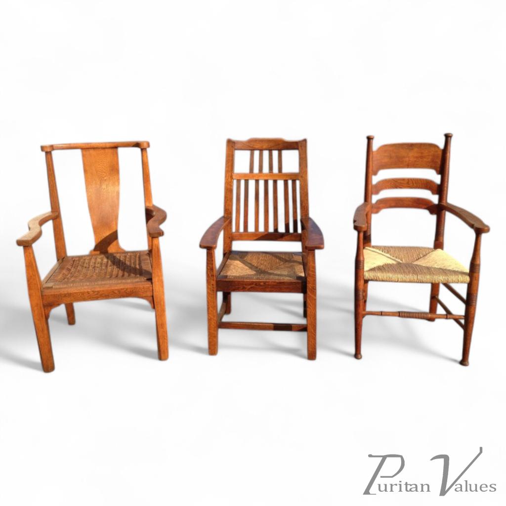 An AWS Simpson armchair with shaped back and original ratten drop in seat with another rush seated armchair. Both SOLD. RIGHT. An armchair by William Birch with three shaped ladder back splats. Fully restored. There are also a pair of matching sidechairs which have also been restored. Circa 1900.