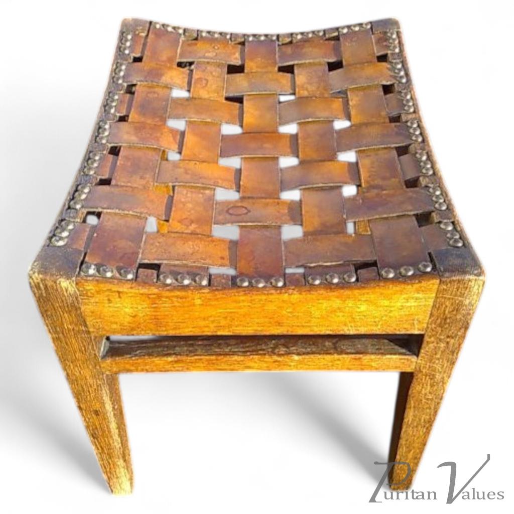 Arthur Simpson. An oak Arts and Crafts stool with inset studded woven leather seat. Circa 1900.