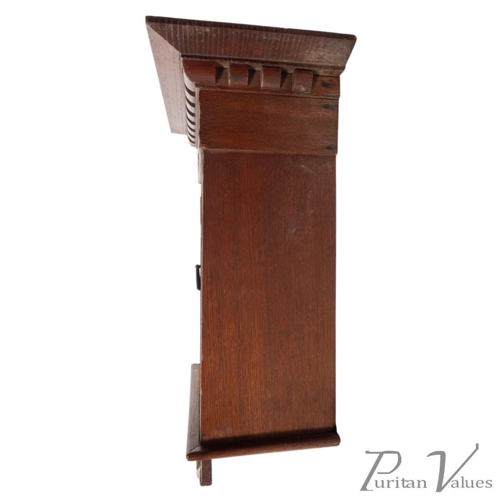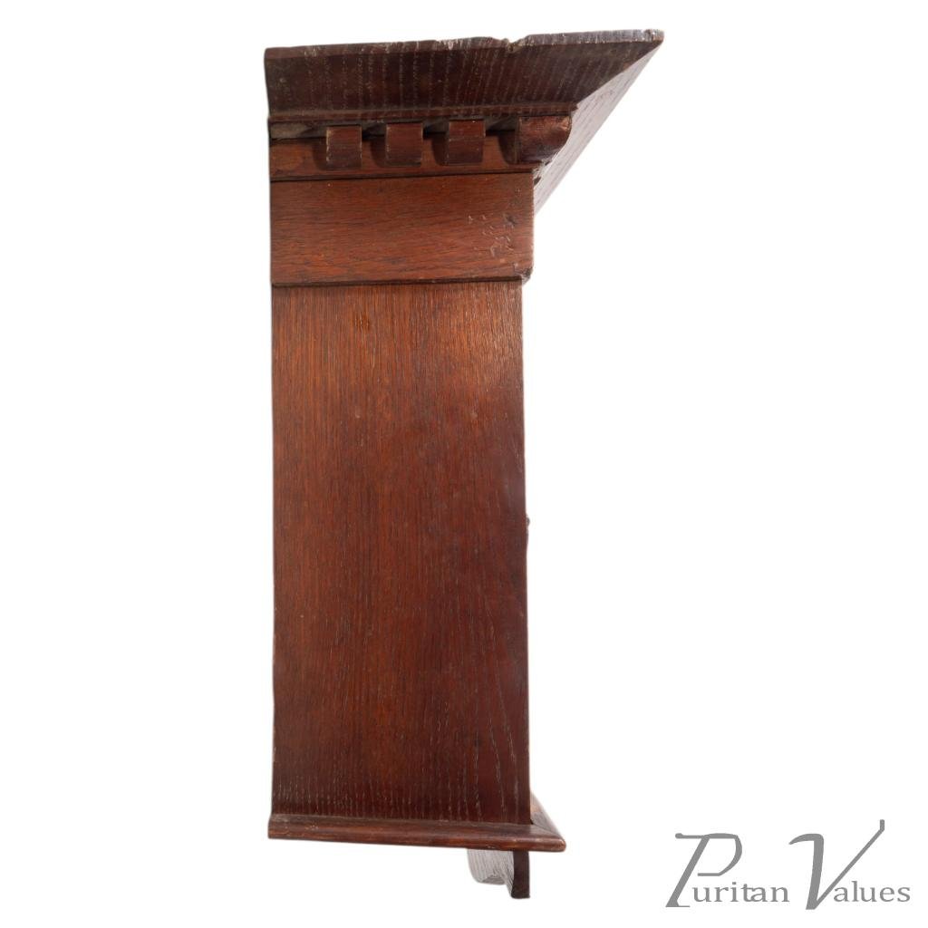This exquisite wall cabinet showcases the distinctive style of the Arts and Crafts movement. Crafted from oak, it features intricate carvings that highlight the natural beauty of the wood. The design emphasizes craftsmanship and simplicity. Its functional yet artistic form reflects the ideals of the era.