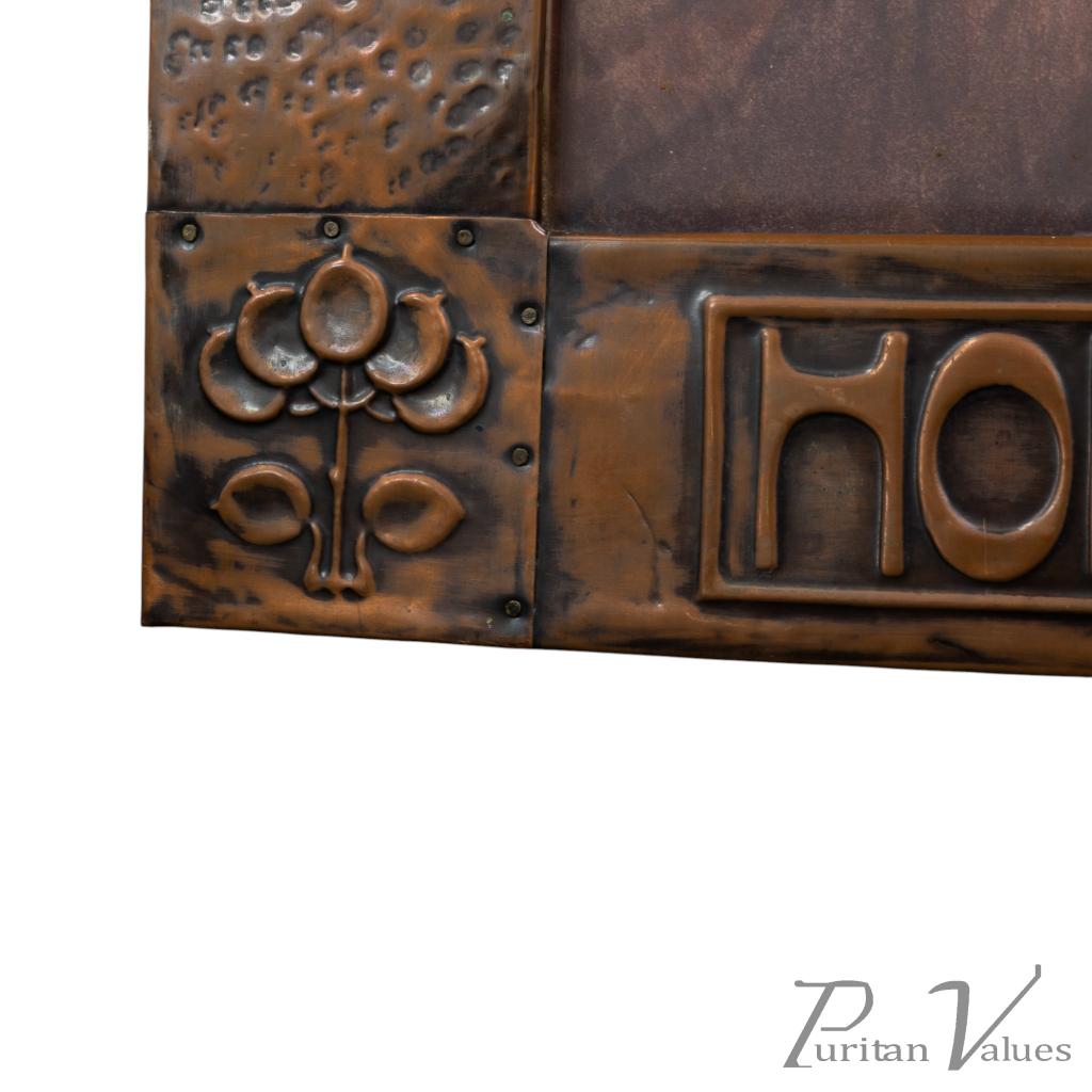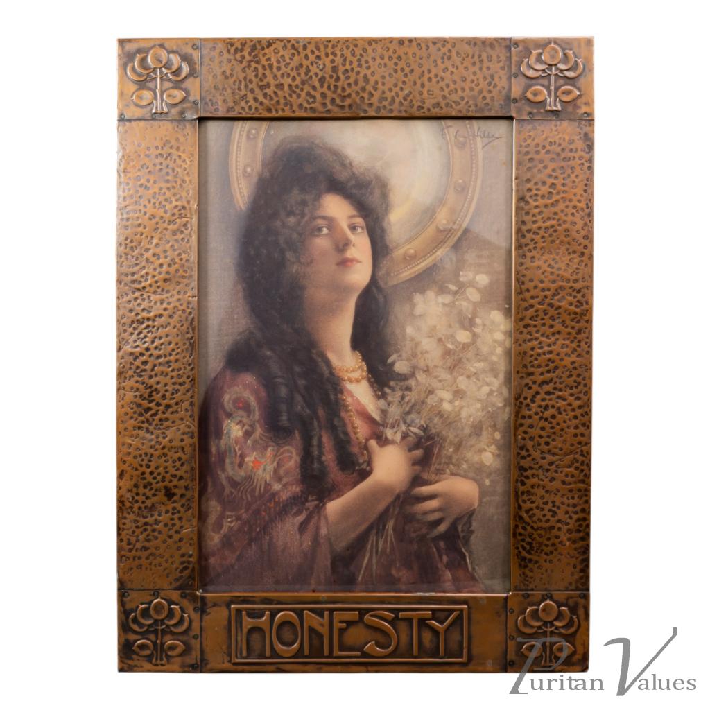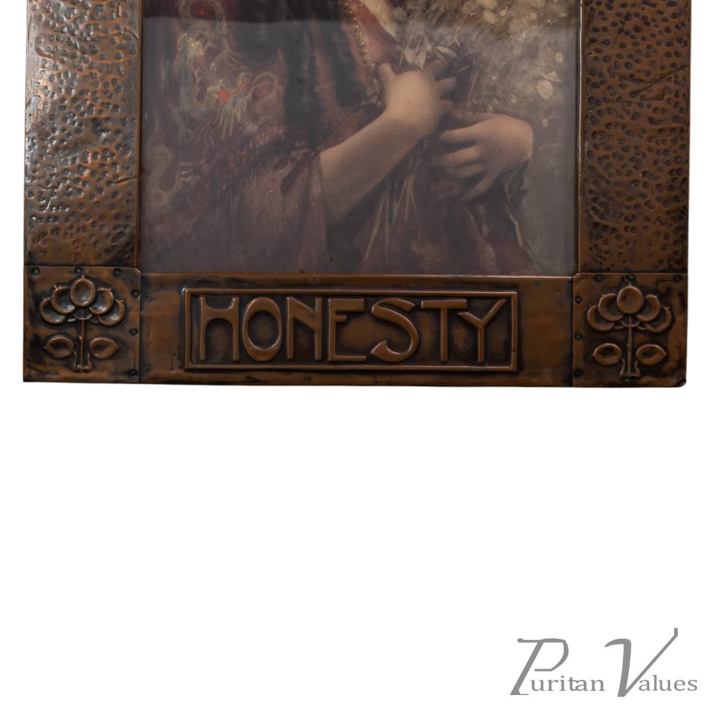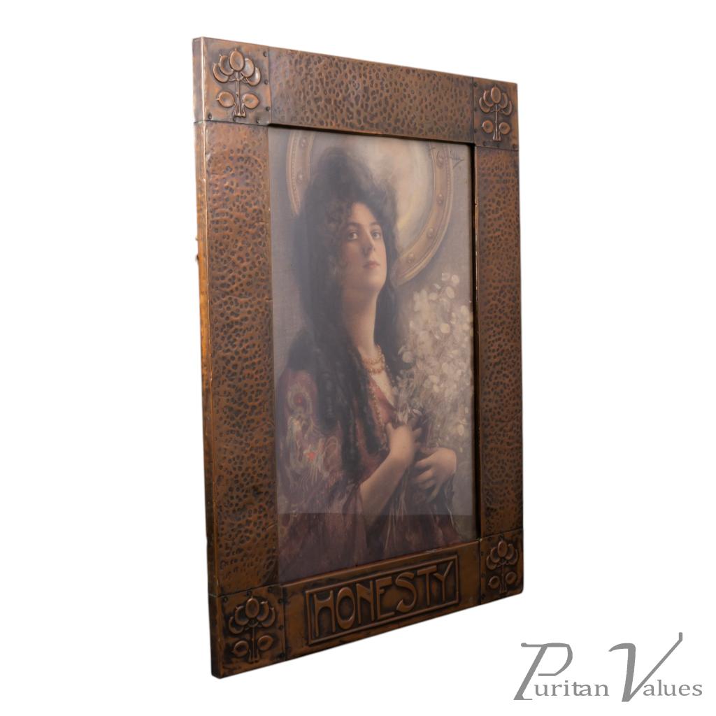 An Arts and Crafts hand-hammered copper frame with 'Honesty' in stylized writing to the base, and honesty floral decoration to the corners, retaining the original Pre-Raphaelite maiden holding a bunch of honesty flowers.