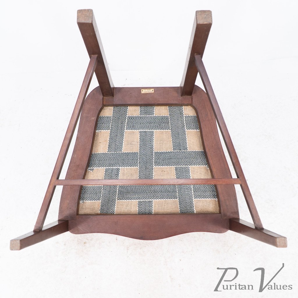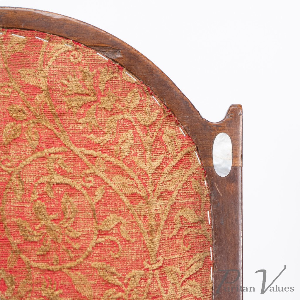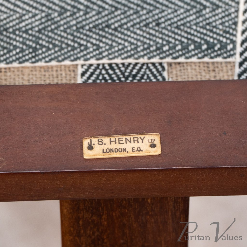 and made by J. S. Henry, with arched top and oval mother-of-pearl inlays just below the ears and sinuous arms with conforming seat details to the side and subtle curve to the front and extra strengthening uprights between and stylised floral inlay to the back splat with original label and original fabric.