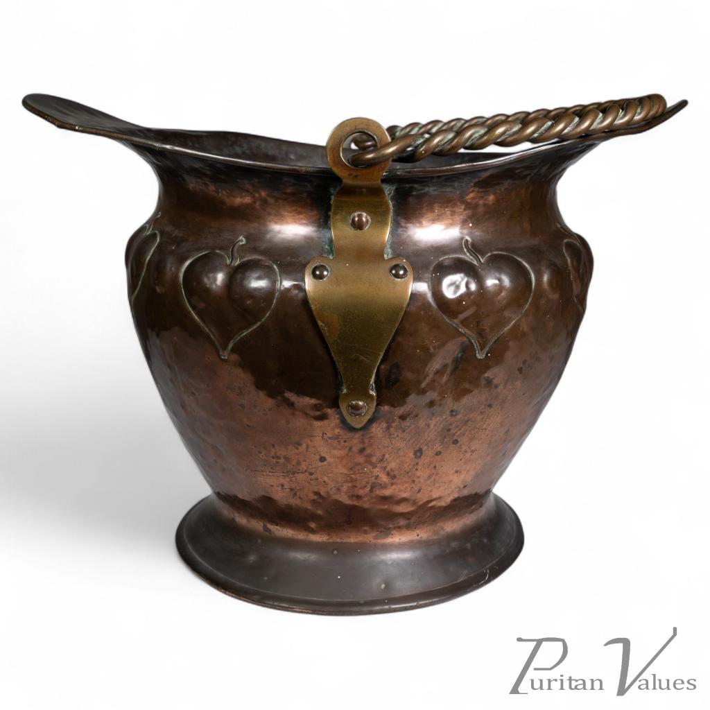 Arts & Crafts Copper Coal Bucket W. Repousse Leaf Decoration & Rope Twist Handle