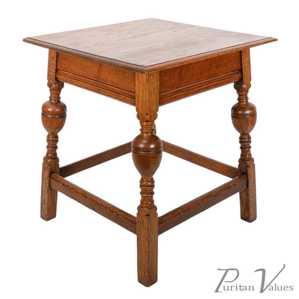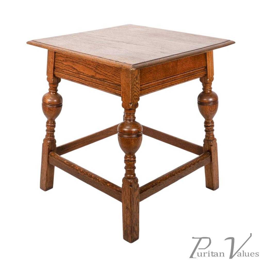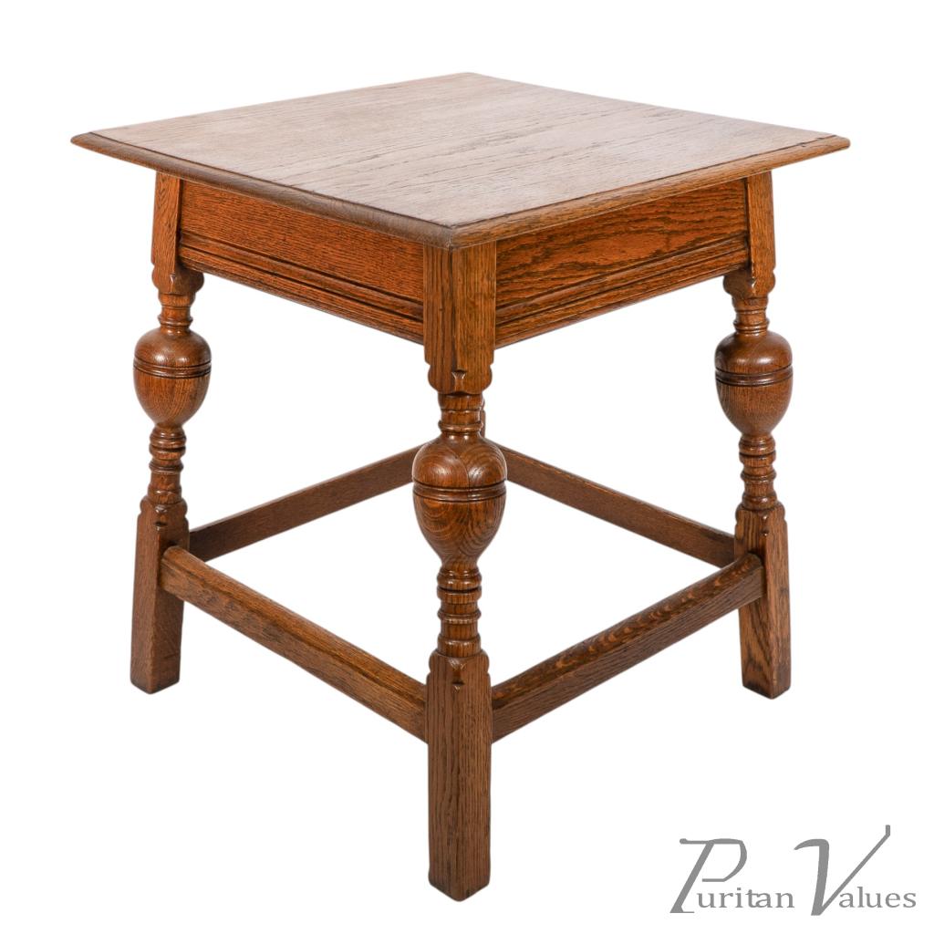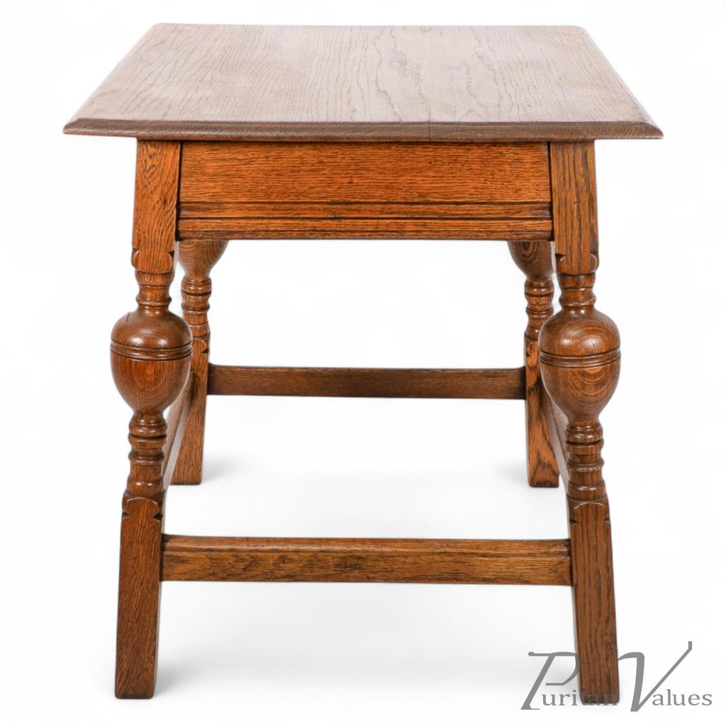 An oak Arts and Crafts side table with a moulded edge and line decoration to the lower apron below, the splayed legs with turned and bulbous details to the centres, united by a wrap around stretchers with moulded details to the top rails standing on square legs.