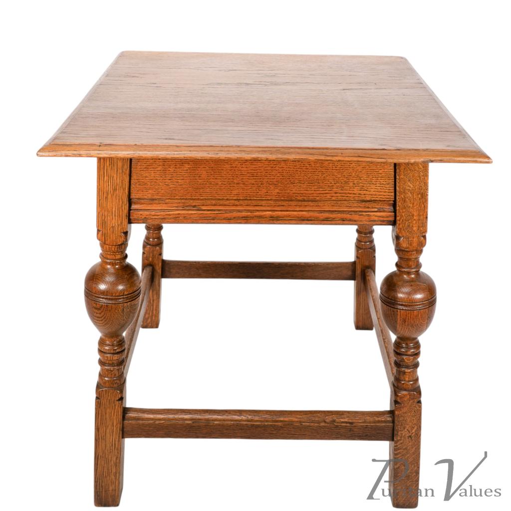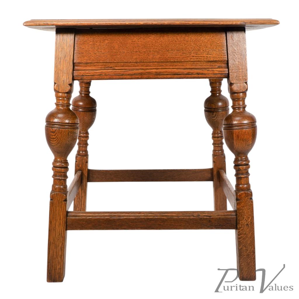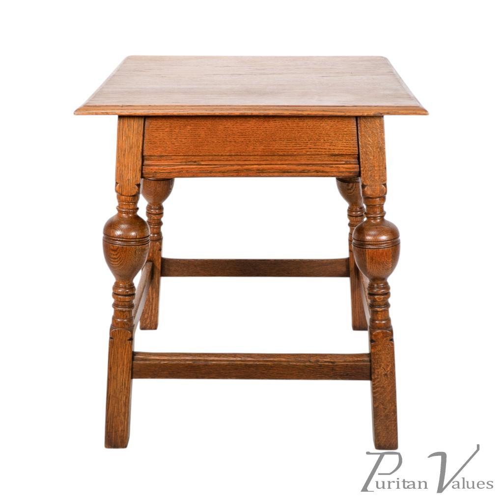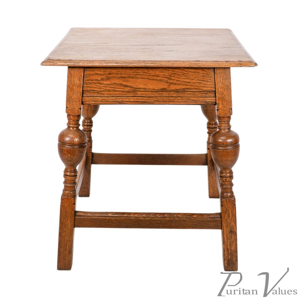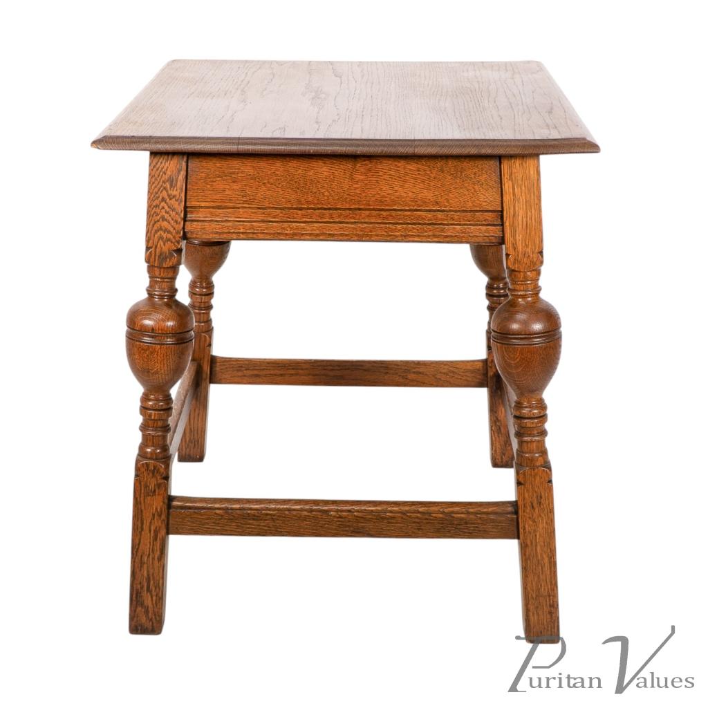 An oak Arts and Crafts side table with a moulded edge and line decoration to the lower apron below, the splayed legs with turned and bulbous details to the centres, united by a wrap around stretchers with moulded details to the top rails standing on square legs.