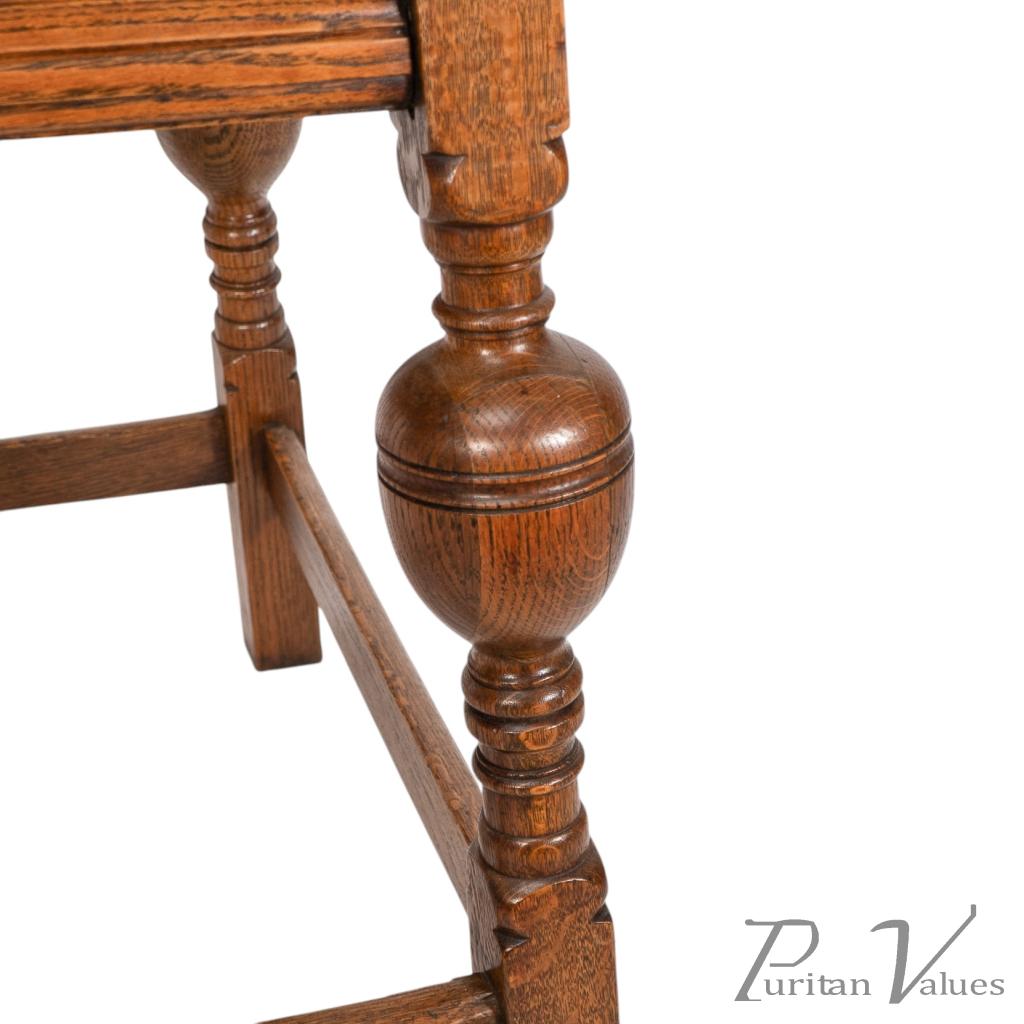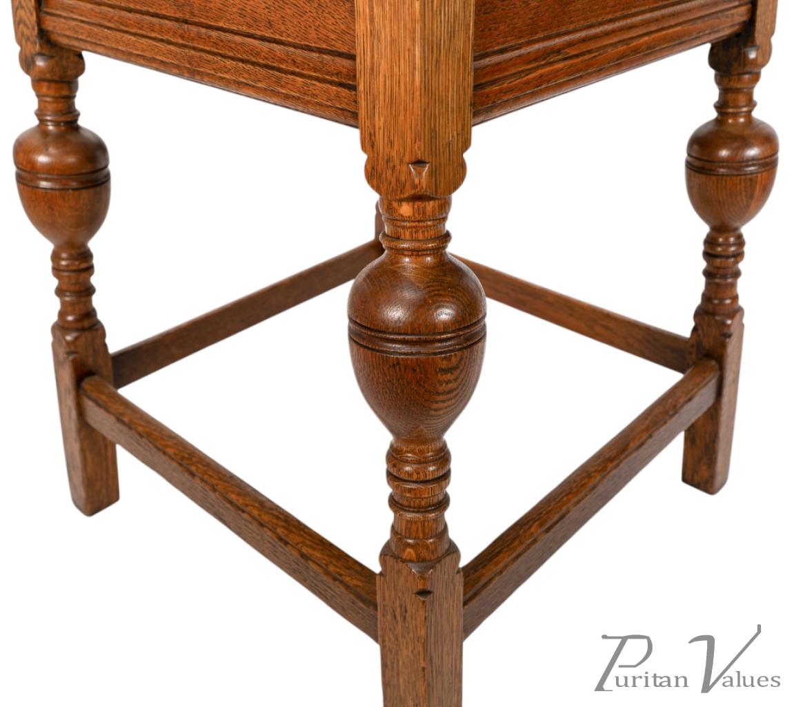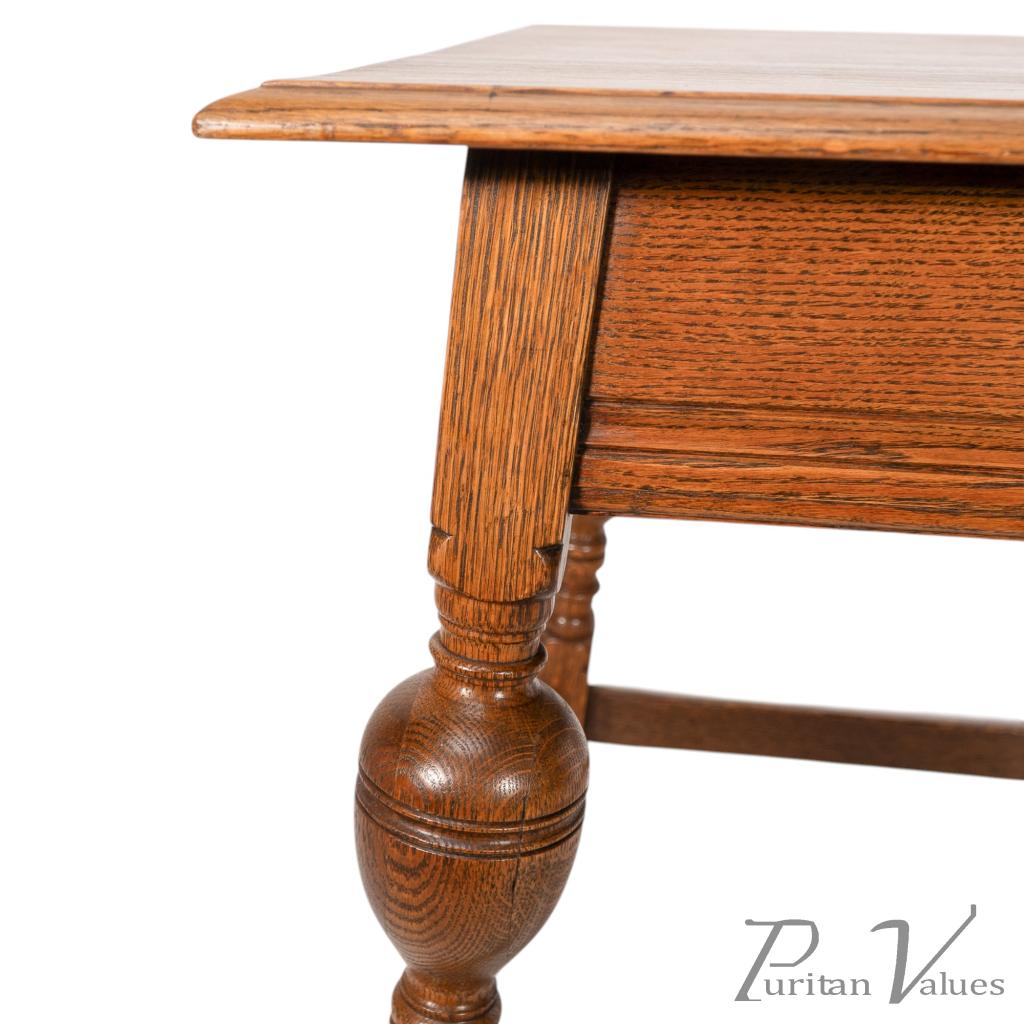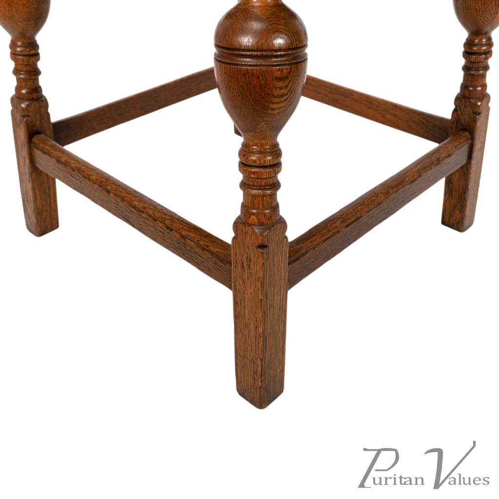 An oak Arts and Crafts side table with a moulded edge and line decoration to the lower apron below, the splayed legs with turned and bulbous details to the centres, united by a wrap around stretchers with moulded details to the top rails standing on square legs.