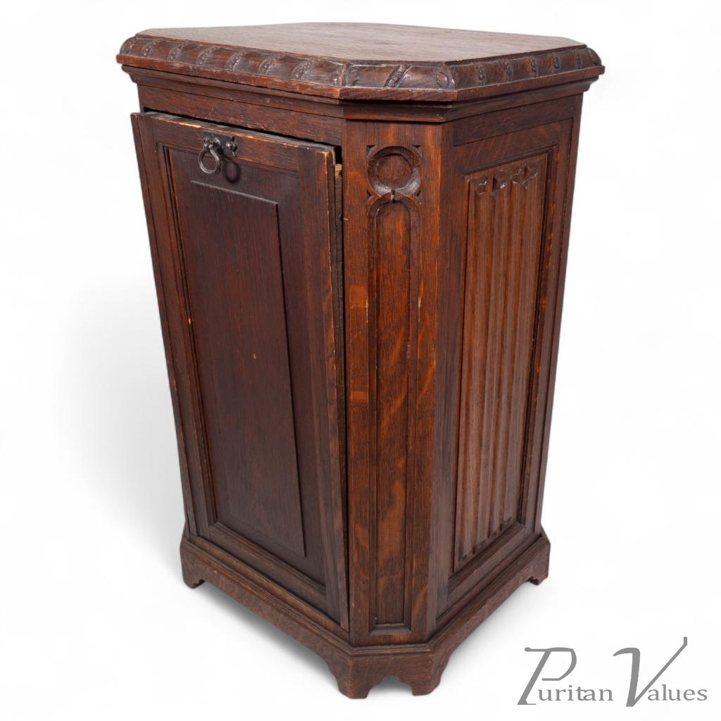A Gothic Revival oak coal purdonium with seed carving to the edge of the top and linen fold carvings to the front and to the sides, with blind fret details to the canted edges.