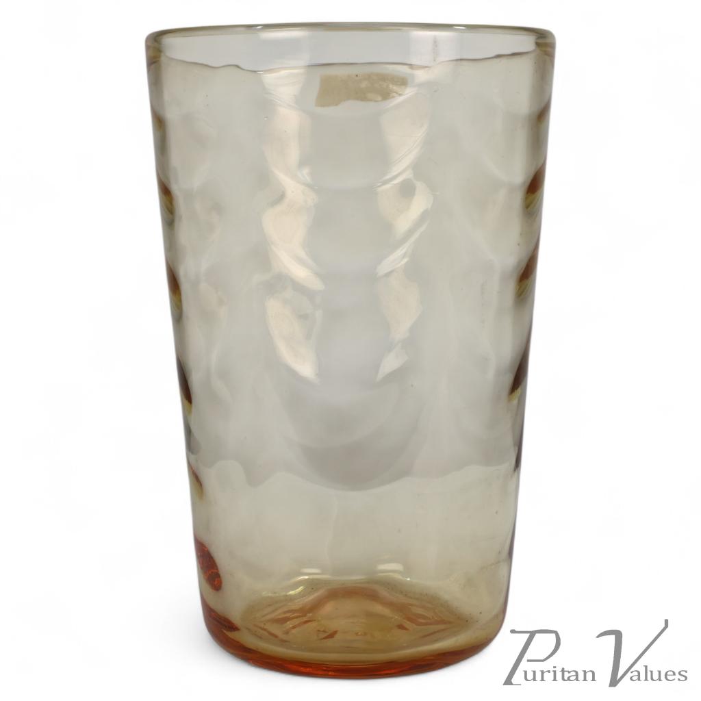 This Whitefriars amber glass vase was designed by Barnaby Marriott Powell around 1938, model number 8473. The tall cylindrical form with ribbed surface and thick base captures the transitional spirit of British Modernist glass, merging craft precision with industrial refinement.