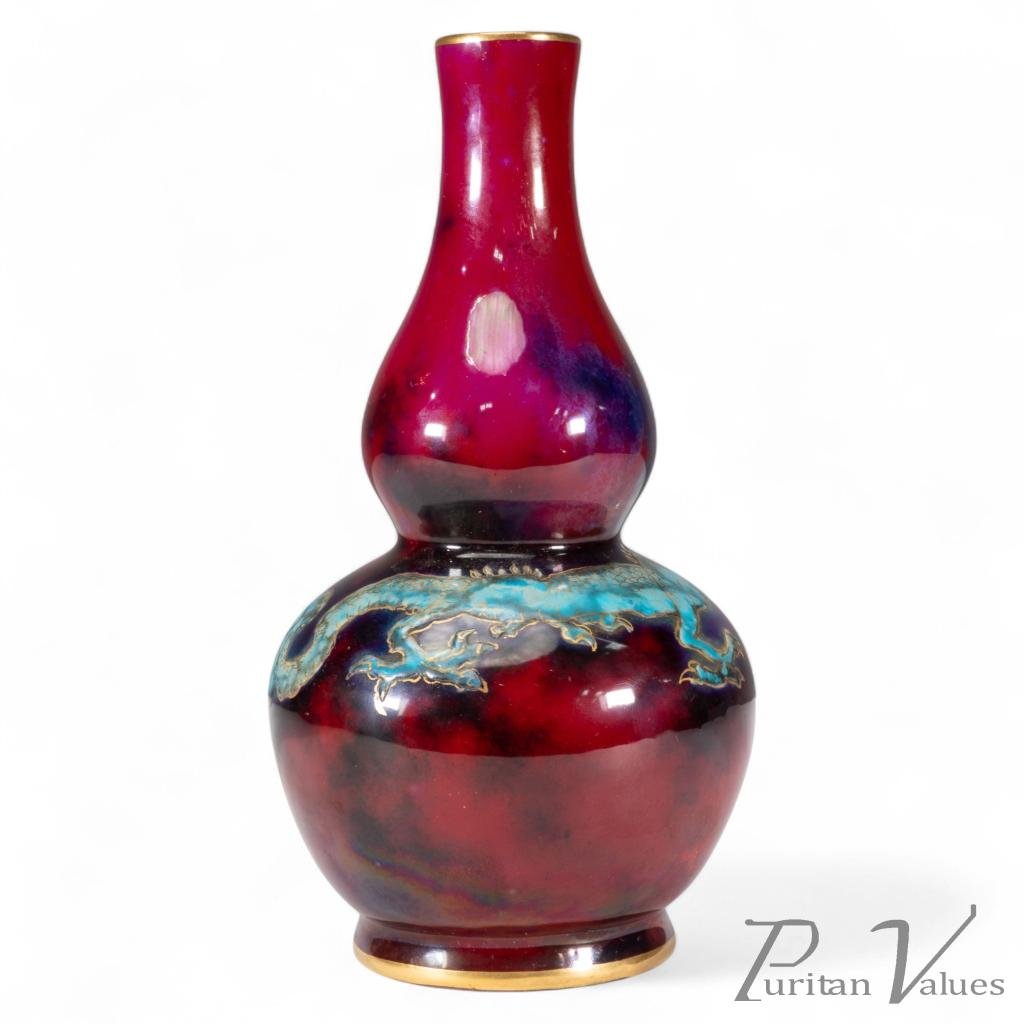 Vase in ceramic, aligned to Japonisme, c.1900. A compact double-gourd profile with a rich red flambe glaze that breaks to inky blue at the shoulder. The body is decorated with a sinuous dragon in the Japanese taste, the motif circling the lower bulb and enlivening the glaze with movement. Scale and presence make this an effective cabinet or mantel piece; the base is signed Bernard Moore.