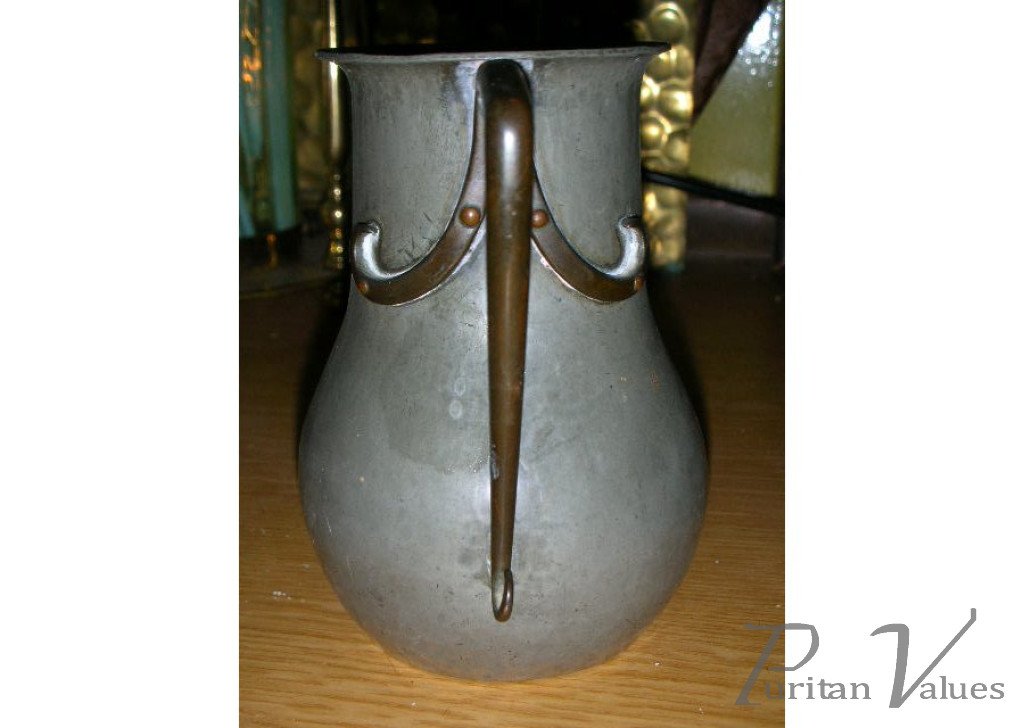 A little pewter jug with a stylised brass handle attributed to Arthur S. Dixon and made by The Birmingham Guild of Handicraft. Height 5", Width 4". Circa 1900. This Jug has all the attributes of A S Dixon. See Arts and Crafts Metalwork, Blackwell, the Arts and Crafts House 2003, page 27 and 39. An exhibition held at Blackwell, one of the most famous Arts and Crafts houses in the United Kingdom which was designed by M.H.Ballie Scott. E-Mail: www.blackwell.org.uk