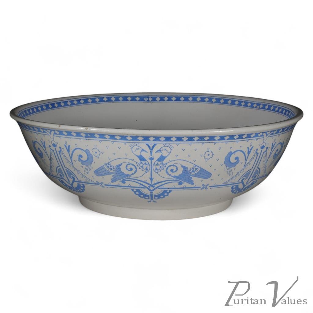 A large Aesthetic Movement white bowl with blue printed love birds and stylized decoration around the bowl.