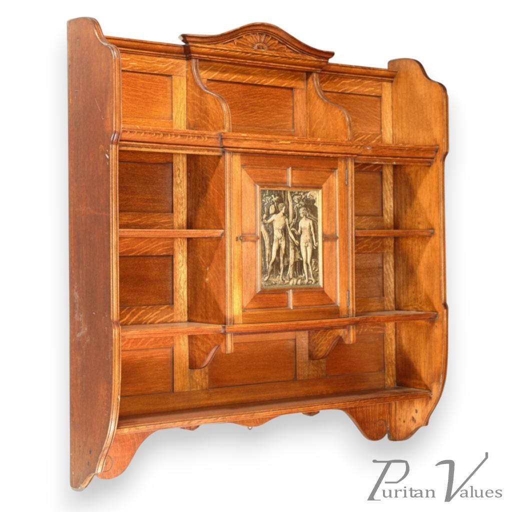 At the centre, a small door is inset with a printed image of Adam and Eve after Albrecht Dürer, the panel framed by simple mouldings so the picture becomes a quiet focus within the rectilinear scheme. The lower rail projects to form a narrow ledge, while the flanking shelves provide ordered storage for books and small objects. The composition aligns with Talbert’s domestic vocabulary of panel divisions and measured ornament current in late nineteenth-century Gothic Revival interiors.