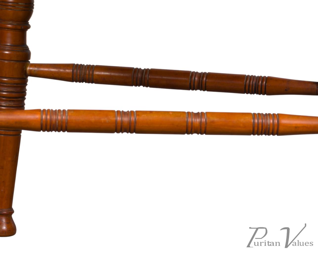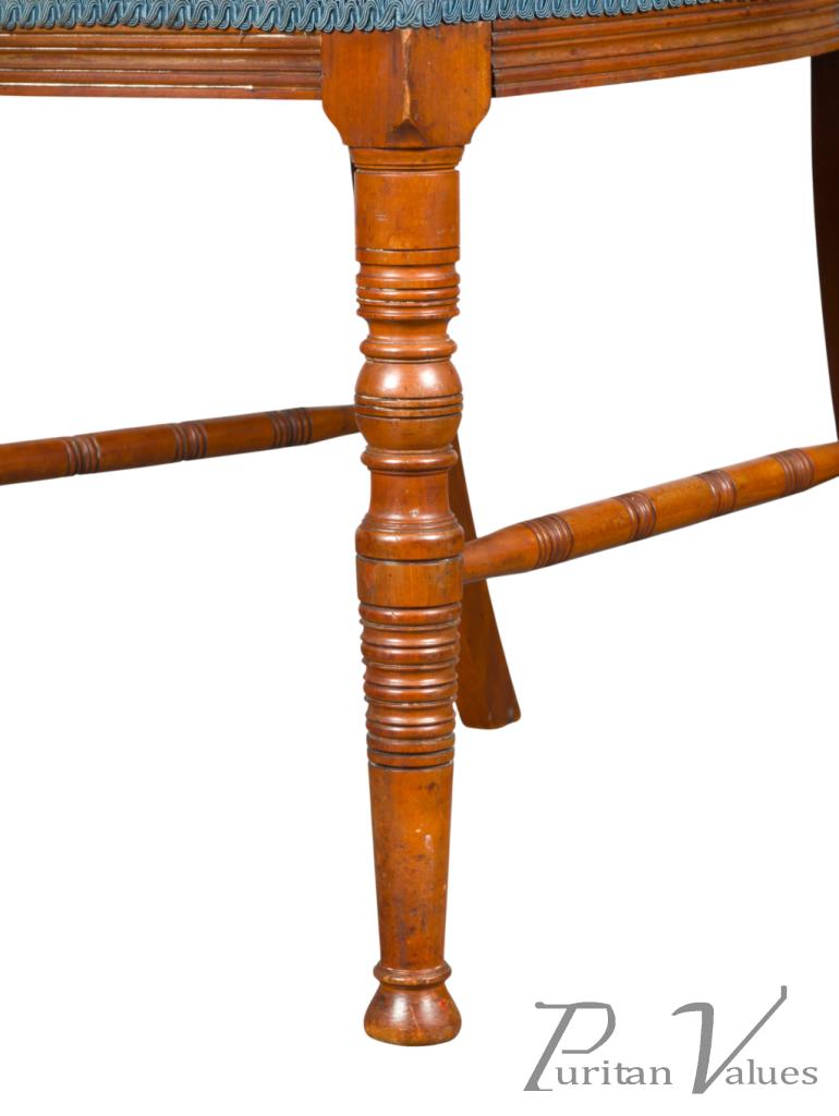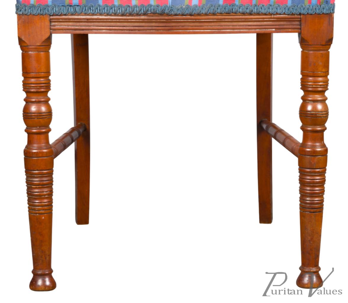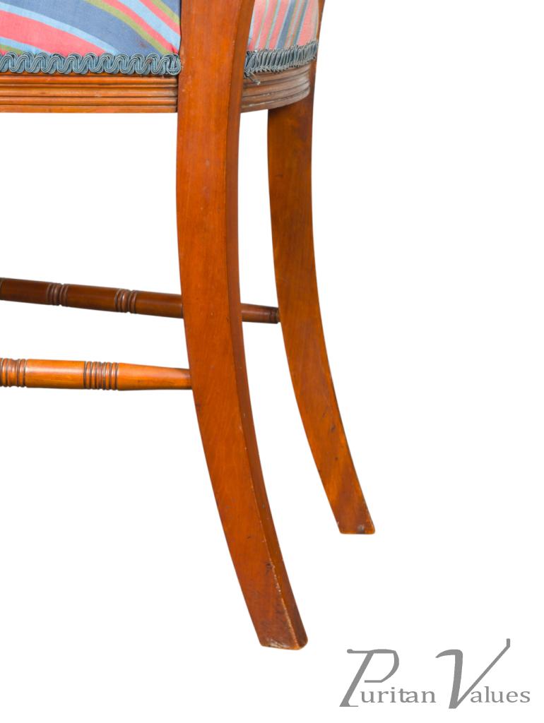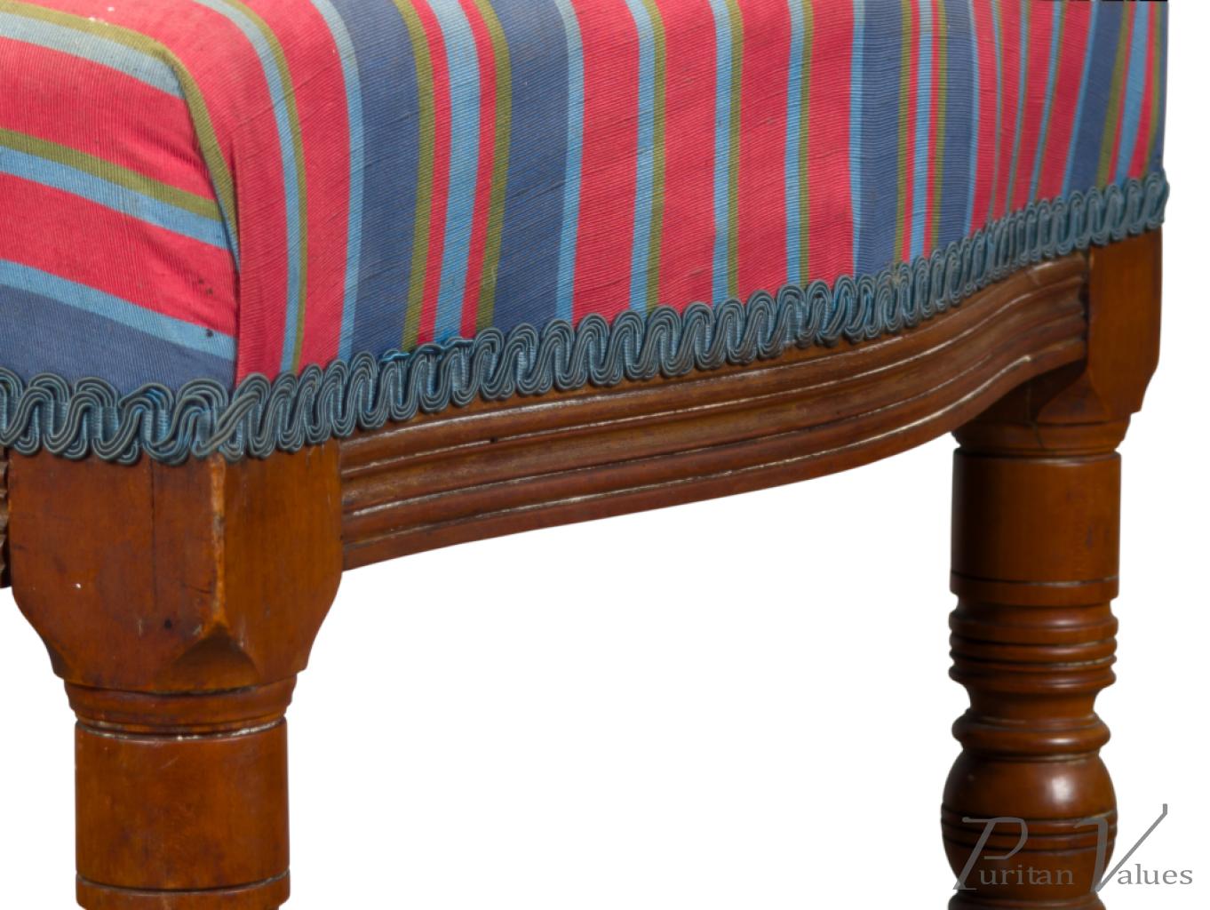 The back is centred with a row of five turnings, surmounted by carved floral ornament above the seat, the whole raised on fine ring turned legs terminating in Thebes style feet, with sabre profile back legs, united by turned side stretchers. Retaining traces of original gilding, the shaping of the back gives this example a notably supportive, comfortable sit, and represents a more ergonomic and elegant example than Talbert’s more typical chair designs.