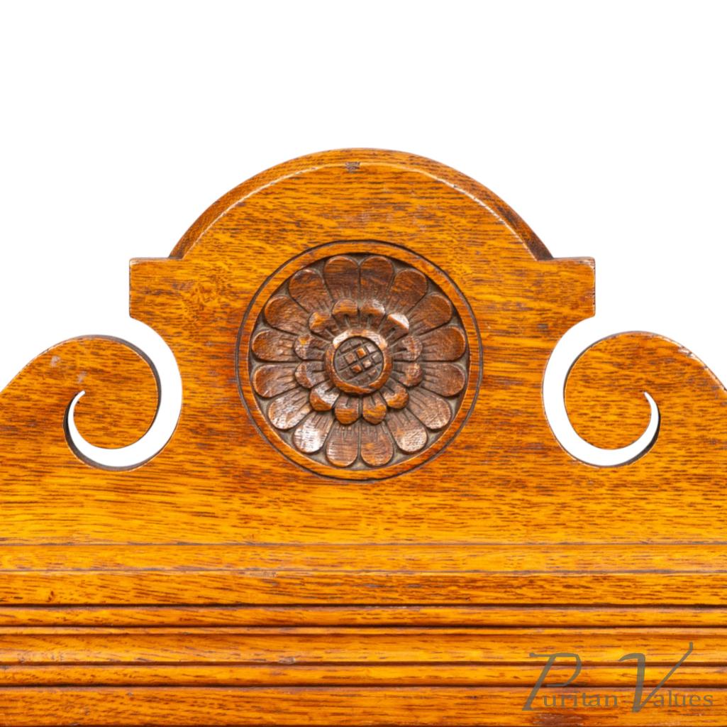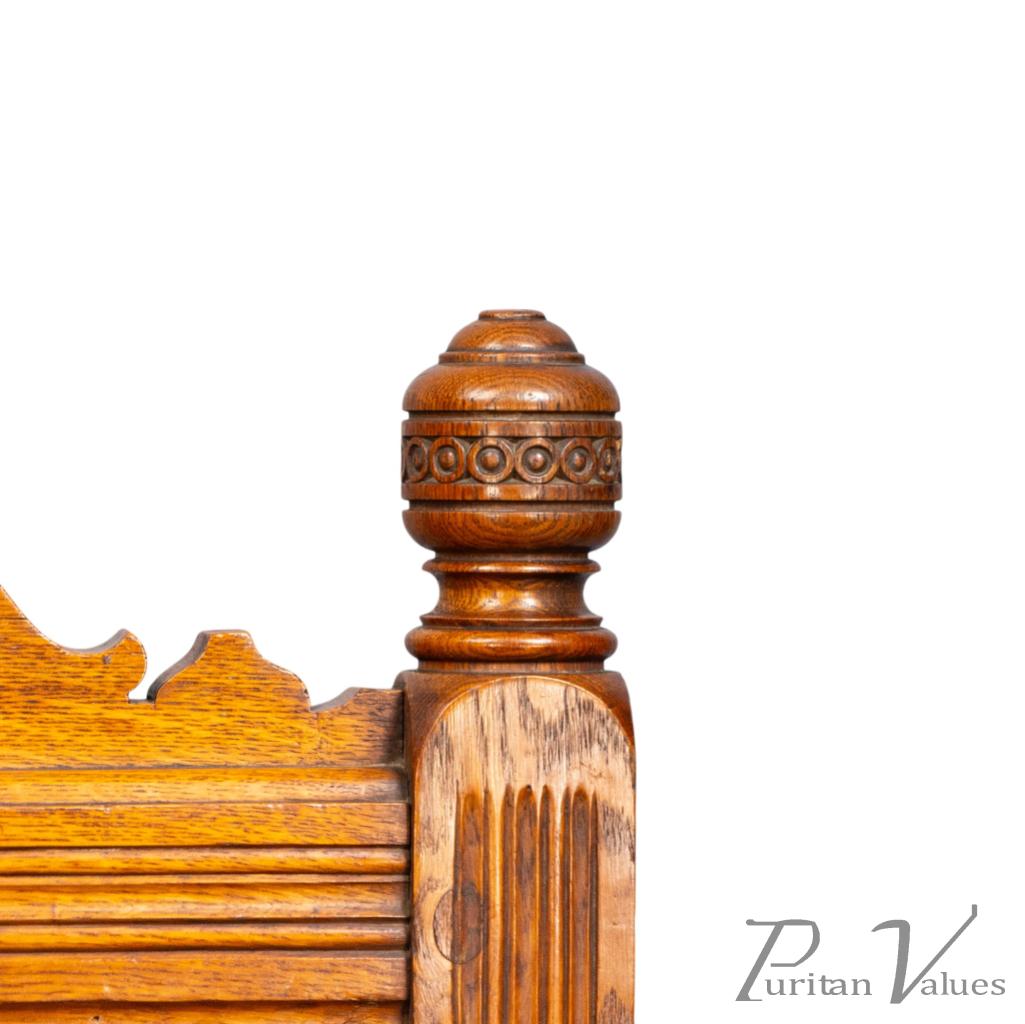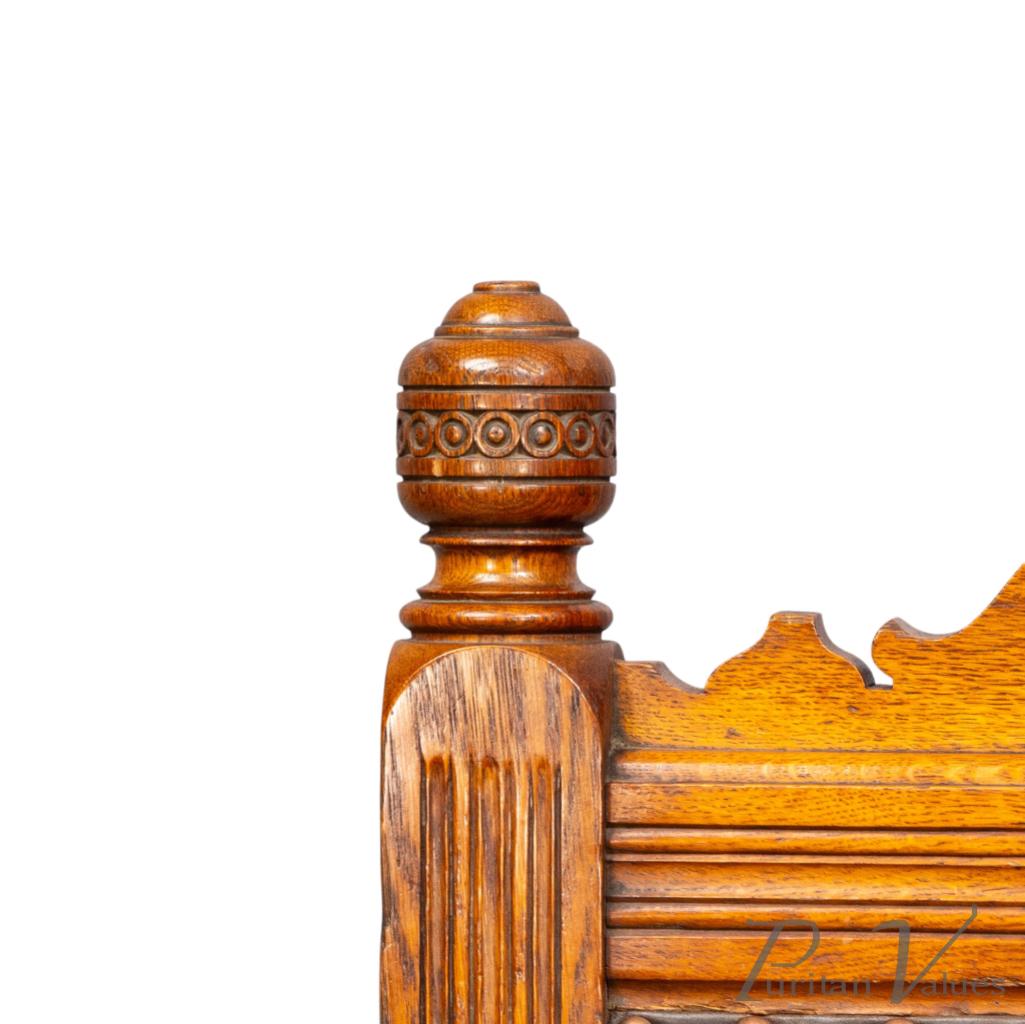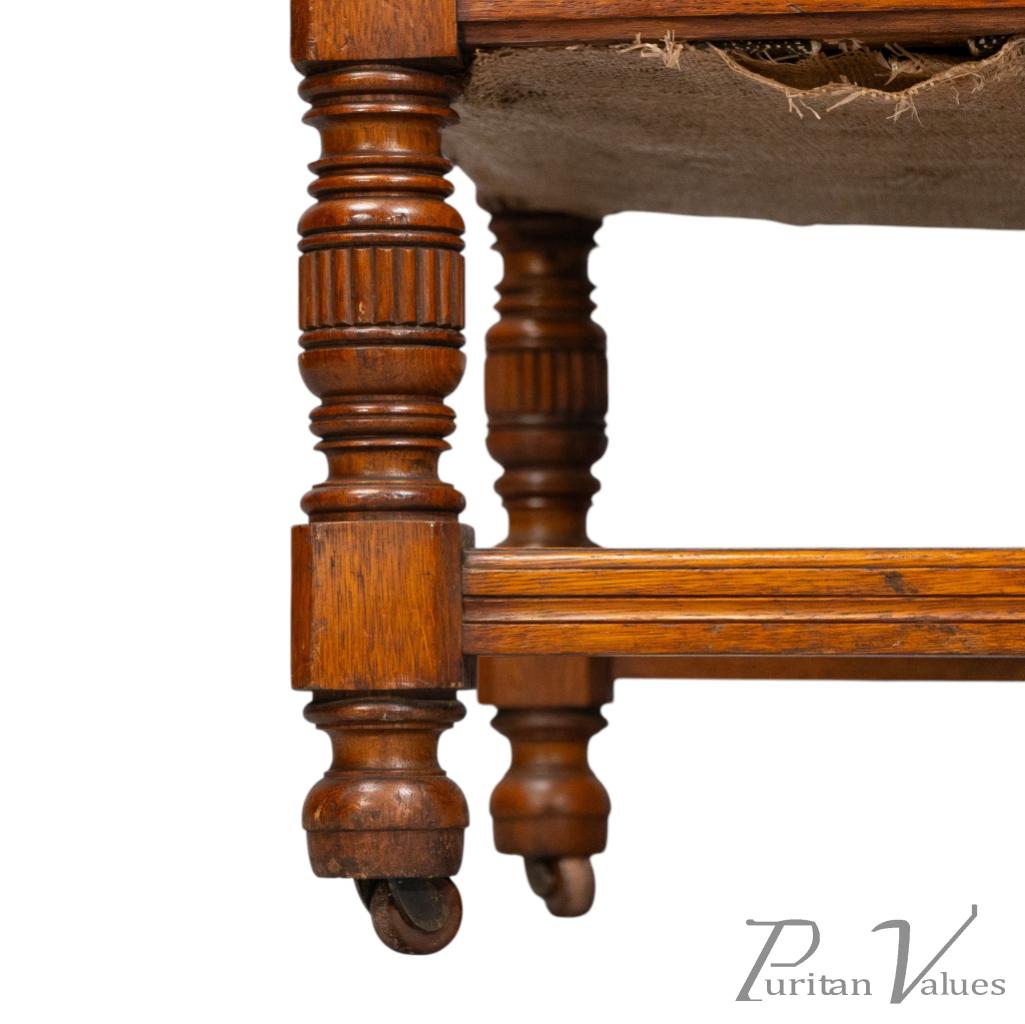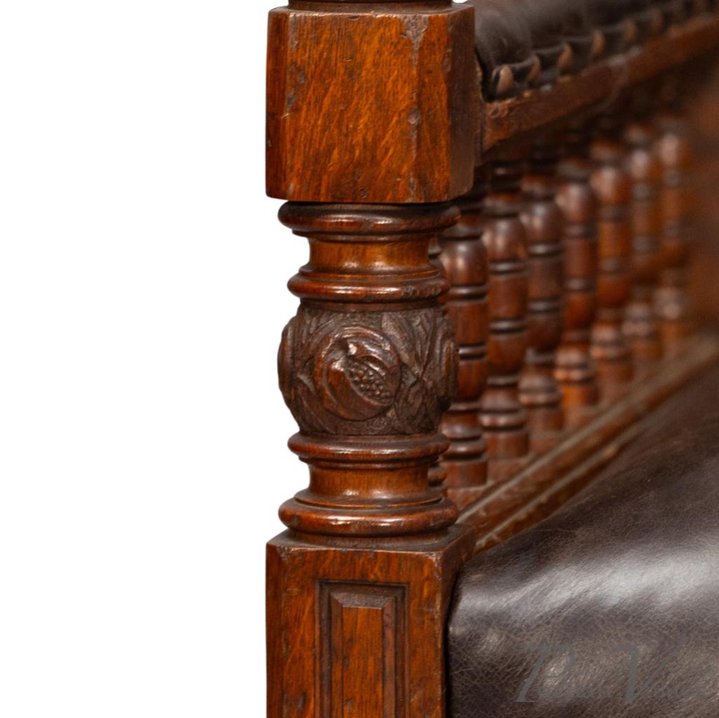 A Gothic Revival oak armchair with shaped head rail centred with a carved floret, flanked by carved floral finials. Beneath the arms are turned galleries and carved finials to the front. On turned and fluted legs united by an H stretcher, and on the original brass and ceramic castors. Ready for upholstery.