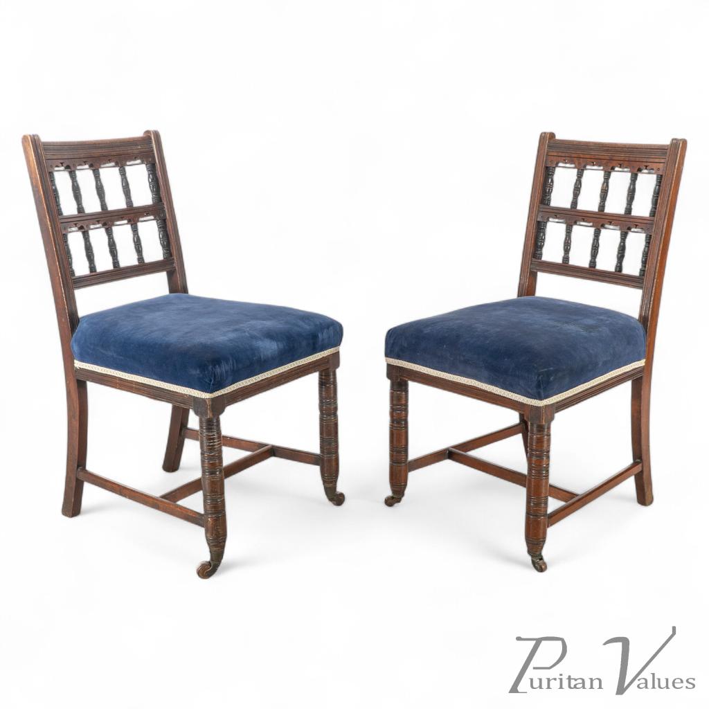 A good pair of Aesthetic movement walnut dining chairs designed by Bruce Talbert and probably made by Gillows of Lancaster. This pair has a nice contrast with ebonized spindles to the backrest. The chairs are also slightly larger all around and a bit more robust than the finer versions I have available.