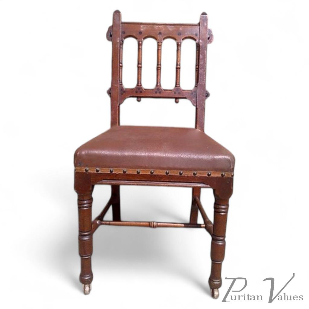 A rare Gothic Revival chair designed by Bruce Talbert made by Gillows of Lancaster, with pyramid tops and arched and turned back with inlaid dot decoration and through pegged construction, turned stretchers and front legs with brass and ceramic castors and wonderful kick out back legs. Circa 1870.