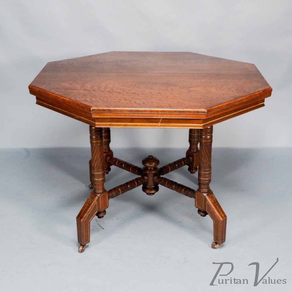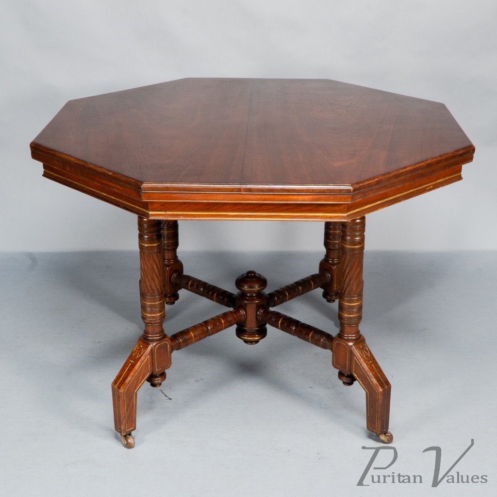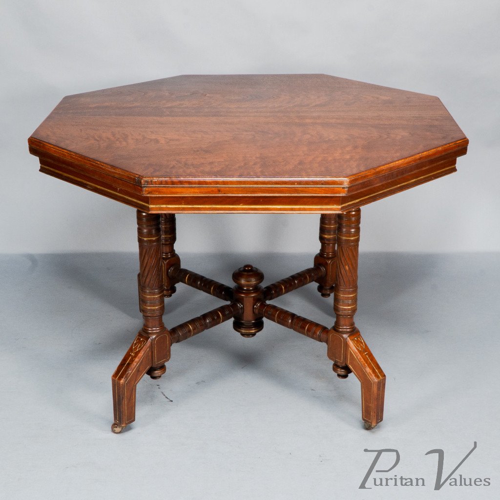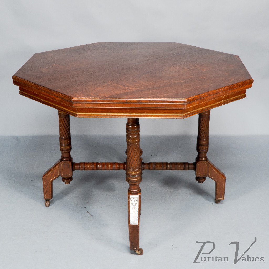 An Aesthetic Movement walnut and gilt octagonal centre table with ring and spiral turned legs terminating in turned finials, united by a turned cross stretcher joined to a central support with further opposing turned finials.