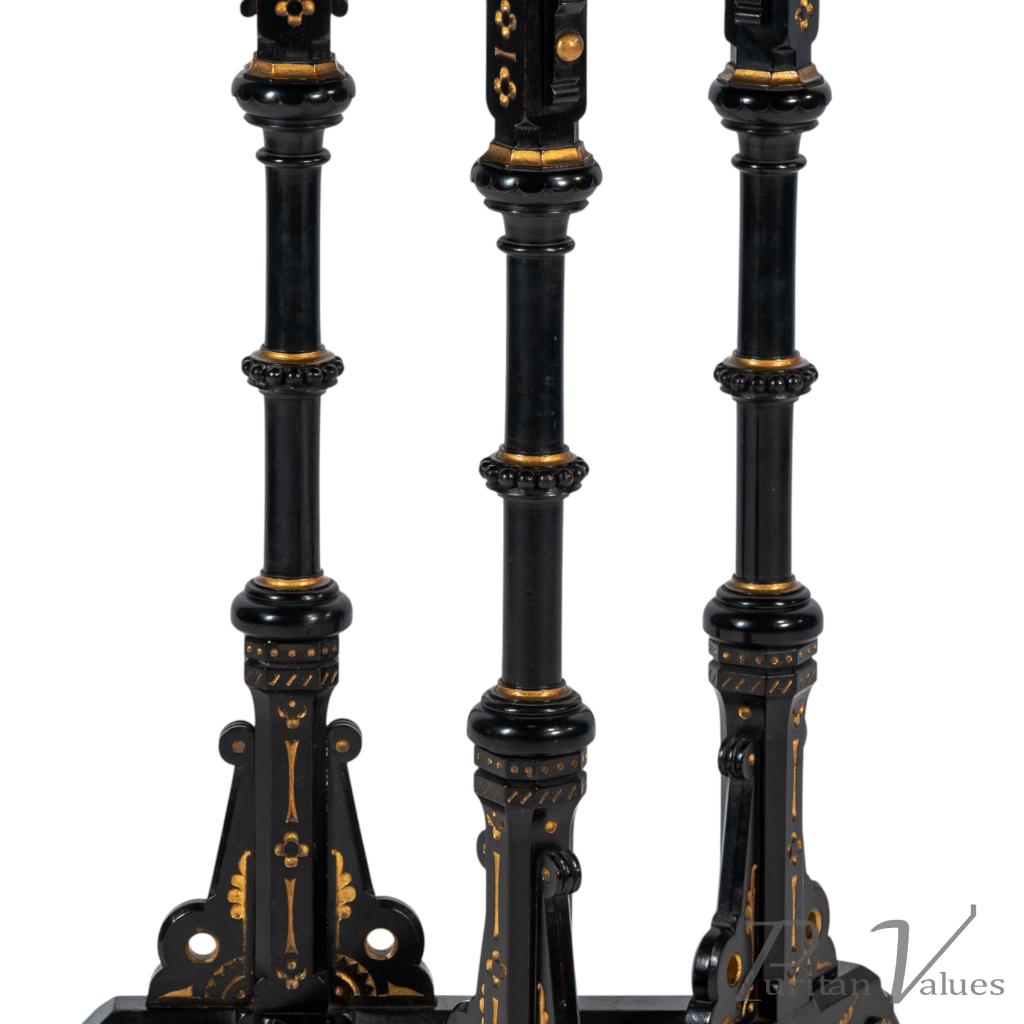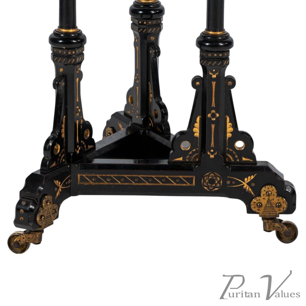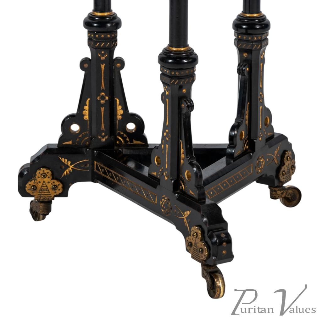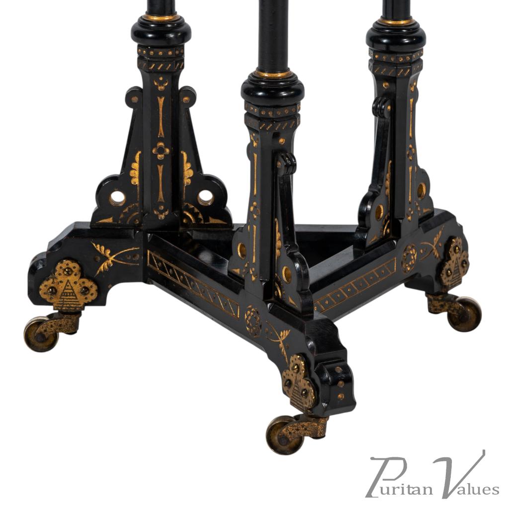 Bruce Talbert, made by Gillows and Co. An exceptional exhibition-quality Aesthetic Movement chess table inlaid with boxwood to the chessboard top, with three baluster legs incised and gilded with floral decoration, stood on a tri-form base with stylised brass castors.