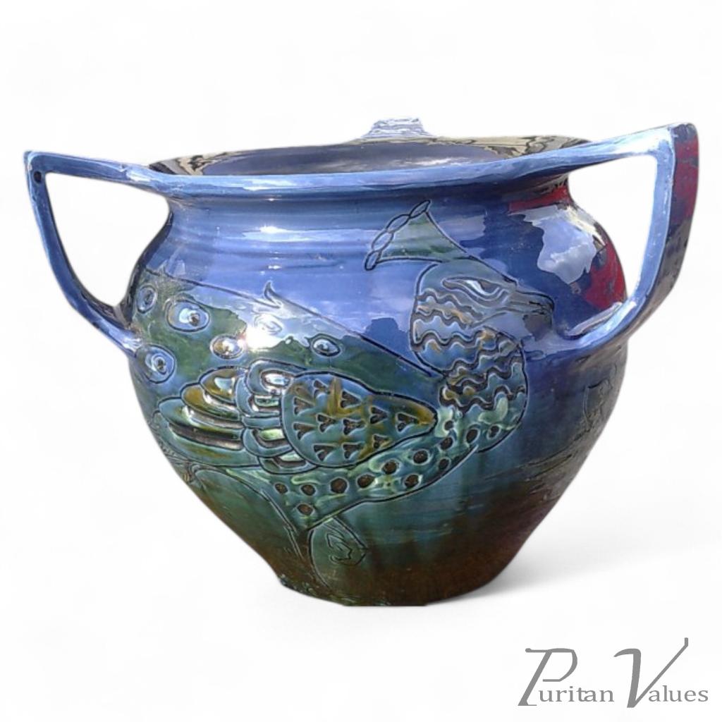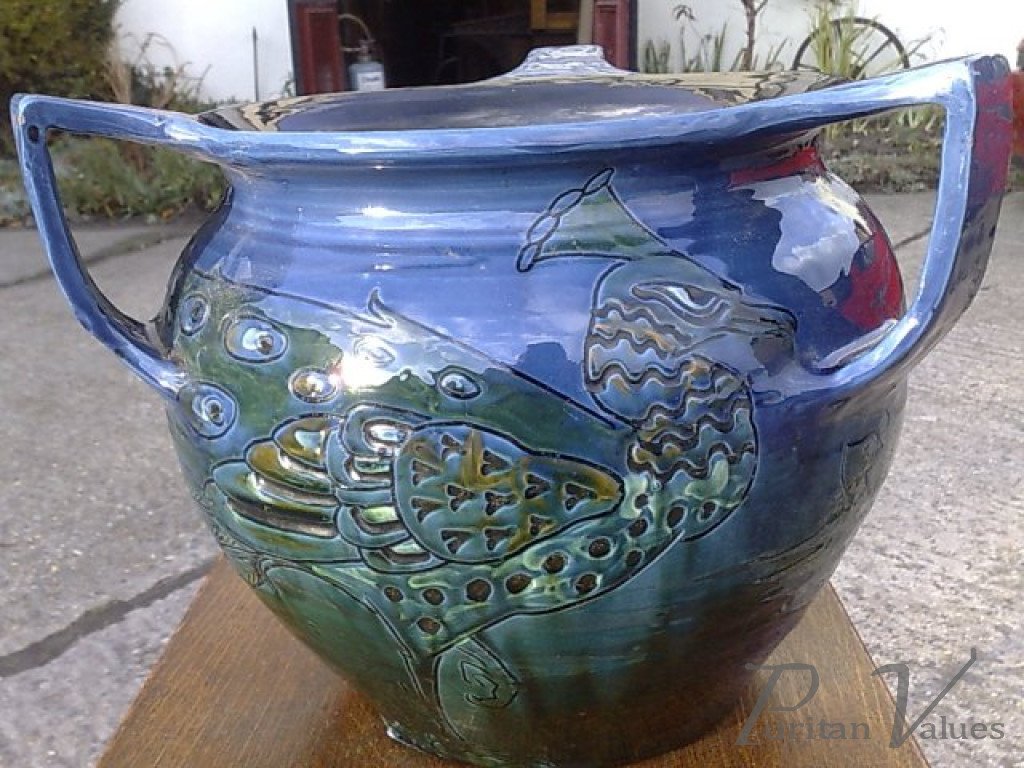 A large C H Brannham three handled planter with a wonderful incised stylised Peacock and incised stylised floral details with wonderful rich vibrant colours. Height 11", Width across the top 14". Circa 1890's.