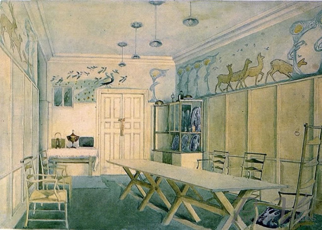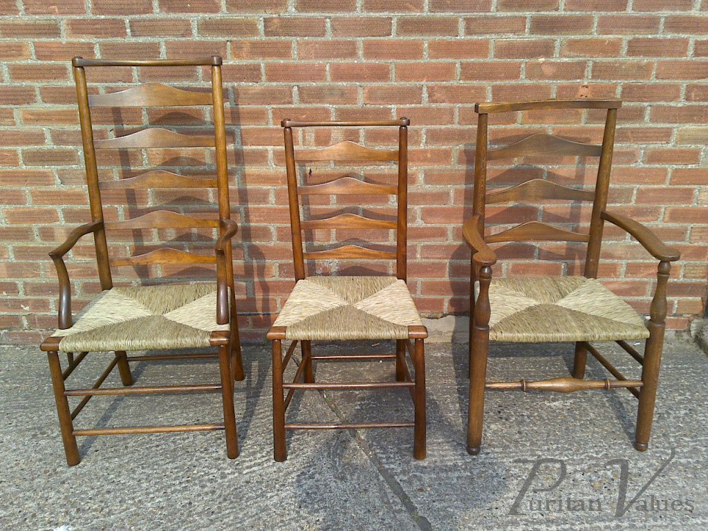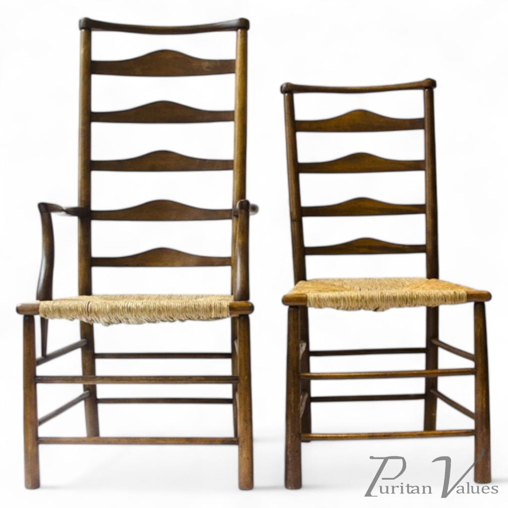 Charles Robert Ashbee (1863-1942) for the Guild of Handicraft. A beech ladderback armchair, with a re-rushed seat, 119cm high; and a single chair en suite. Designed for the dining room of the 'Magpie and Stump', Cheyne Walk, Chelsea, his family home from 1896. One can see the taller ladderback at the head of the table in a watercolour showing the dining room of his house. See Cooper, Jeremy 'Victorian and Edwardian Furniture and Interiors' London 1987, p. 200, illus. 522; Whiteway, Michael and Gere, Charlotte 'Nineteenth-Century Design' London 1993, p. 253, plate 319; and Andrews, John 'Arts and Crafts Furniture' Antique Collectors Club, p. 88, pl. 85.