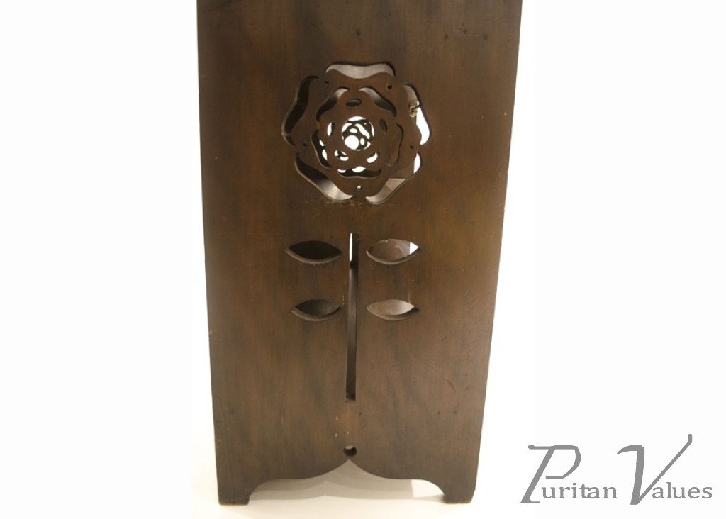 Charles Rennie Mackintosh (1868-1928). A cypress wood writing cabinetmerly green stained, with stylised foliate brass hinges and conforming handles. The lower sides with floral fret work. Provenance: by descent from the relatives of James Guthrie. The writing cabinet was consigned to McTears, Auction House in Glasgow, together with a collection of items, as part of the contents removed a house owned by the Guthrie relatives, including silver and brassware with 'Guthrie' stamped in bold writing onto two separate chargers, two watercolours and an oil painting by Guthrie including some hinges and an associated sideboard all of which I have images of. For similar see Kaplan, Wendy (editor) 'Charles Rennie Mackintosh', pl. 159. opposite p. 233. The original furniture Mackintosh designed for Guthrie and Wells was made from cypress wood and stained green and of simple construction. This unique style and construction are the same. Behind the hinges and handles the original green stain is still as vibrant as the day it was applied. The keyhole escutcheons are identical to the linen press with candle sconces to each side that Mackintosh designed for John Henderson, one of the earliest known surviving pieces he designed. The back treatment of this present lot is the same and has just three wide boards which run from the top right to the floor. The side treatment is also from the top straight to the ground quite typical of Mackintosh. For this see Kaplan, Wendy (editor) 'Charles Rennie Mackintosh', p. 232, fig 160 and Billcliffe, Roger 'Charles Rennie Mackintosh: The Complete Furniture, Furniture Drawings. And Interior Designs', p.34, fig. 1895.6. The metalwork is identical on some pieces and so very similar on others, see the Billcliffe work above, p. 33, fig. 1895.2 and 1895.3 for washstand and dressing table handles. The floral brass hinge mirrors the fretwork flowers to the sides are almost identical to the roses the stylised women are holding on the stencilled decoration he designed for Buchanan Tea Rooms in 1897. For this see Kaplan, Wendy (editor), as before, p. 81, fig. 45 and Billcliffe, as before, p. 40, fig. 1896.11). Taken from an e-mail correspondence on 14/01/09 with Peter Trowles, MLitt., FRSA, Mackintosh Curator, Archives and Collections Centre, the Glasgow School of Art. 'I think your bureau has all the attributes to link it to a Mackintosh-related piece. The underlying green stain, simple case construction and choice of ironmongery are all strong pointers plus you have got the Guthrie provenance'. Height 159cm, Width 96cm, Depth 45cm.