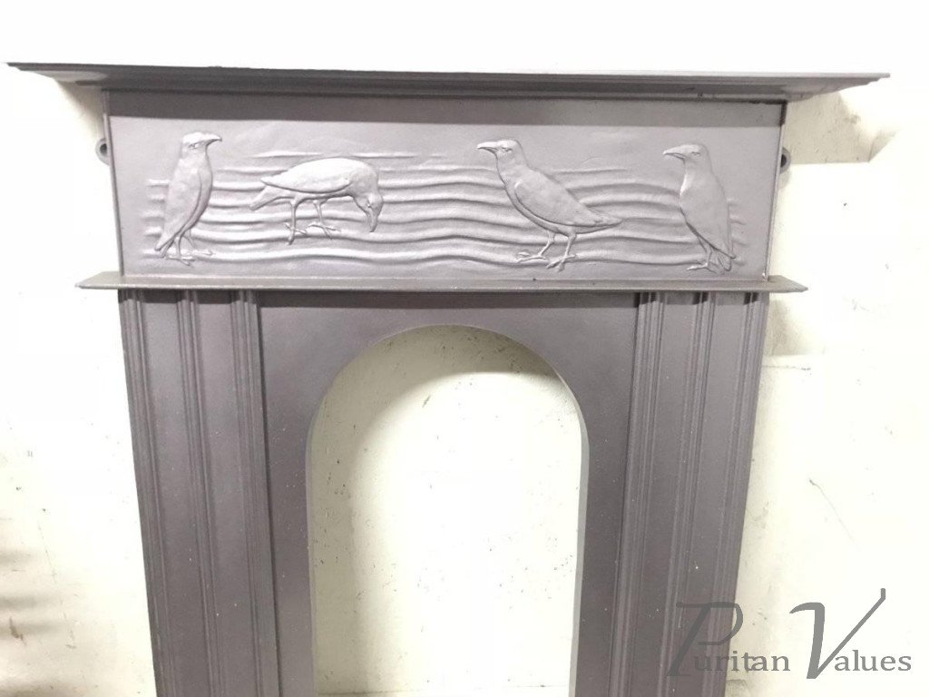 C.F.A Voysey, probably made by George Wright. A rare cast iron fireplace with feeding character crows dining in a field, reminiscent of gentleman in tails. The fireplace has been professionally painted silver at some point which I was happy to leave. Alternately we can strip it back to the original black cast iron. Internal opening measures height to the arch 32" x width 15". Shelf is 5" deep.