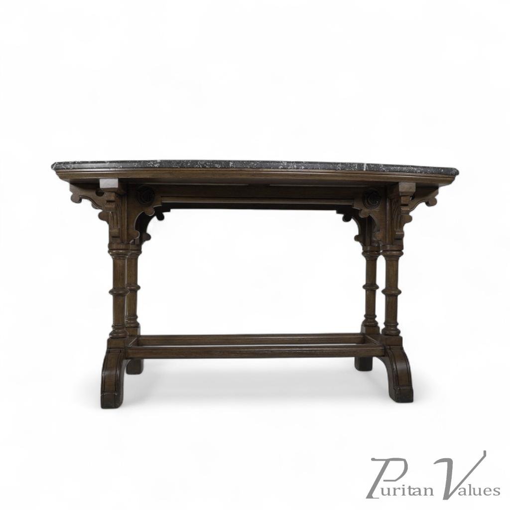 Charles Bevan, attributed. A Gothic Revival Oak Library or Sofa Table with Marble Top