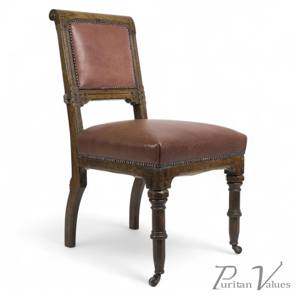 A Gothic Revival side chair with scroll carvings to the upper sides and incised decoration framing the backrest, with chamfered, carved, and dot decoration, and again to the front seat corners. The ring turned legs have octagonal tops. Original brass and ceramic castors to the feet. The hind legs, where they kick out at the back, have a subtle fan carved detail, perfectly put.