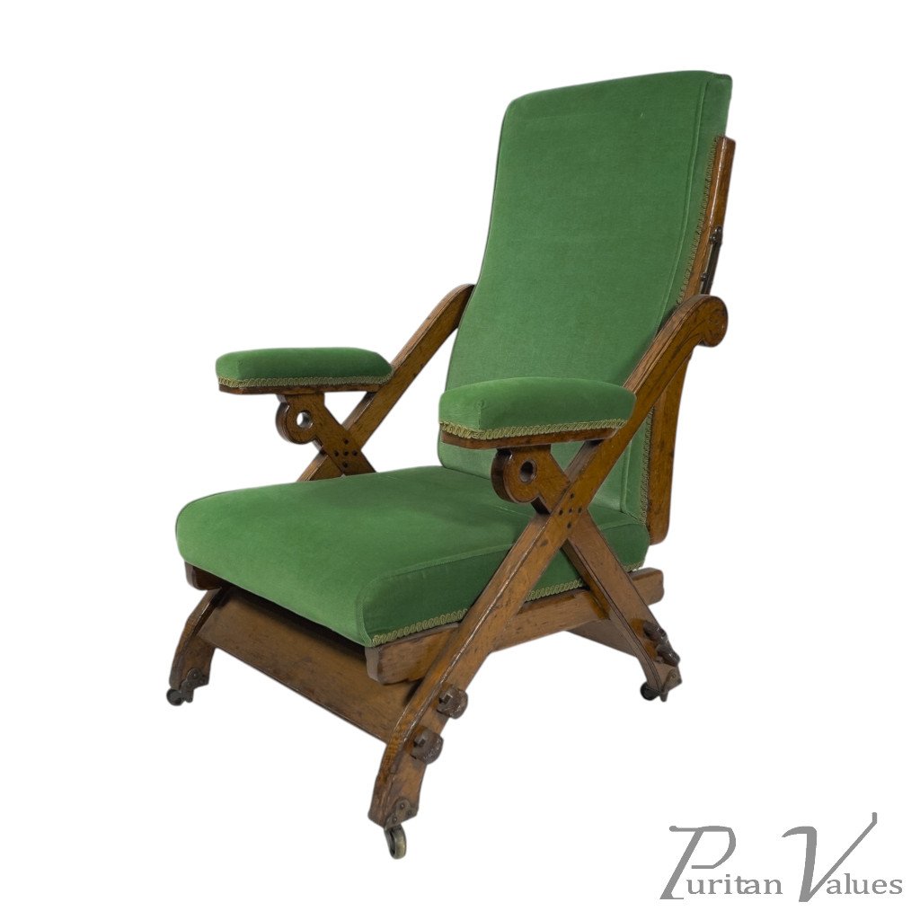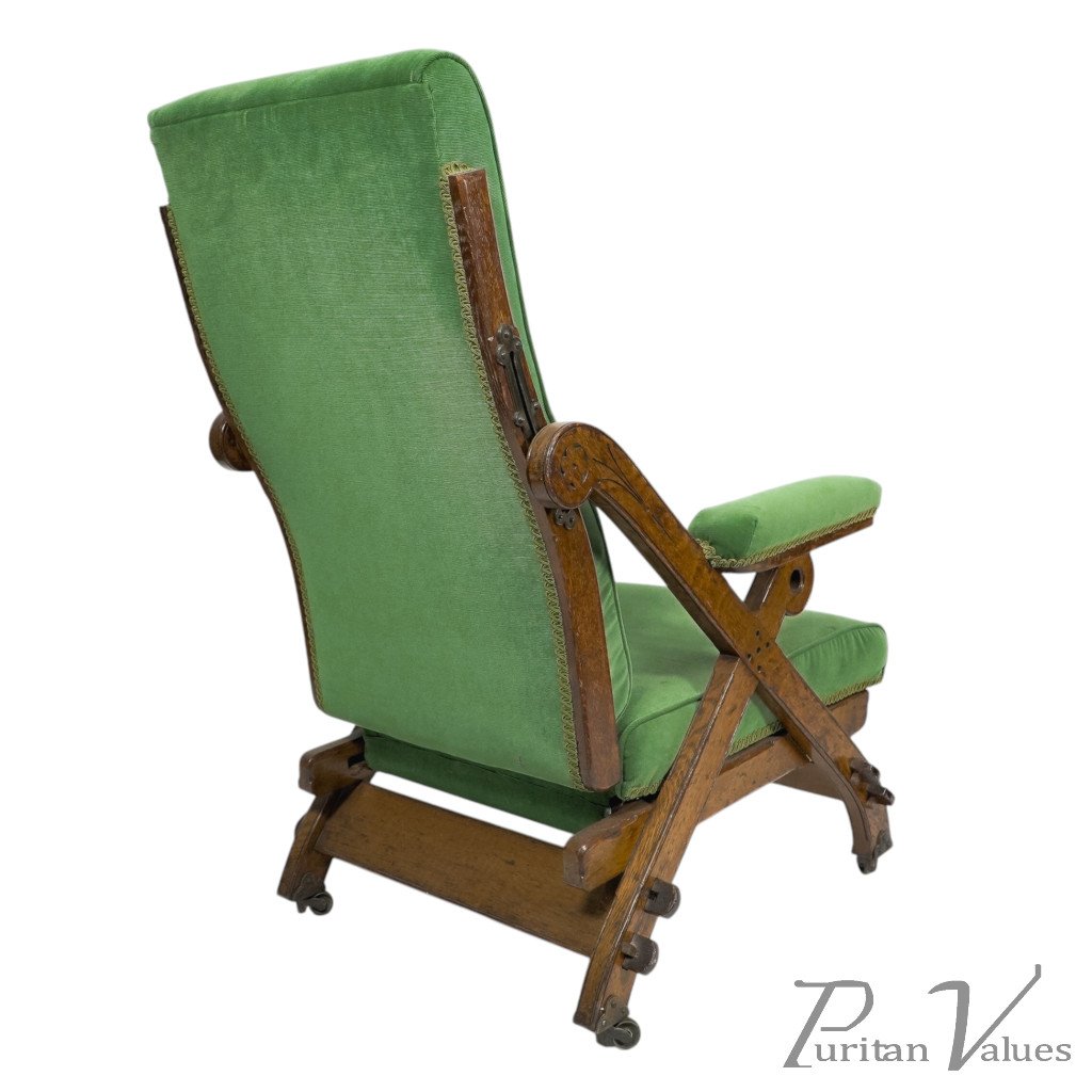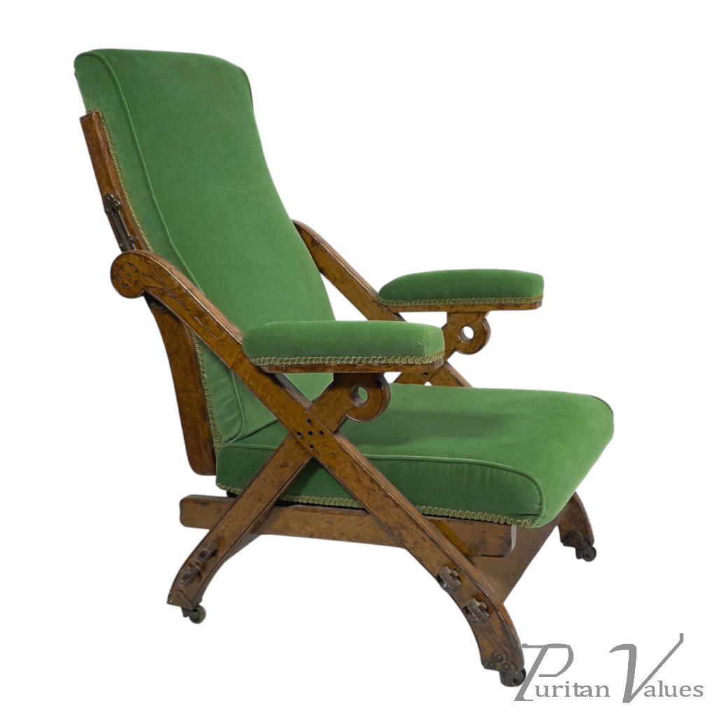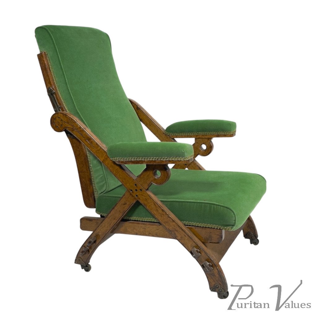A "New Registered Reclining Chair". A Gothic Revival reclining upholstered armchair, with pegged oak frame and original casters. The brass mechanism is in great shape and still works effortlessly.