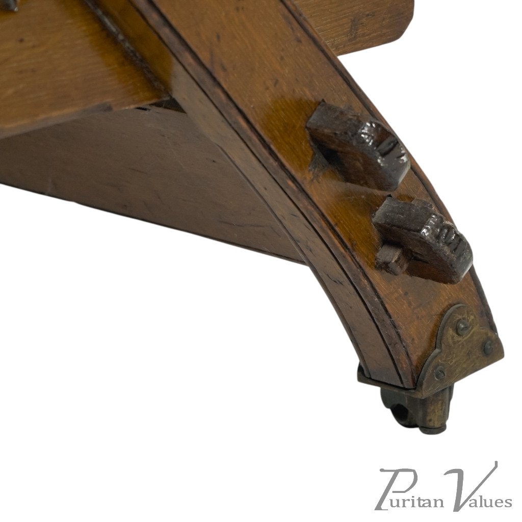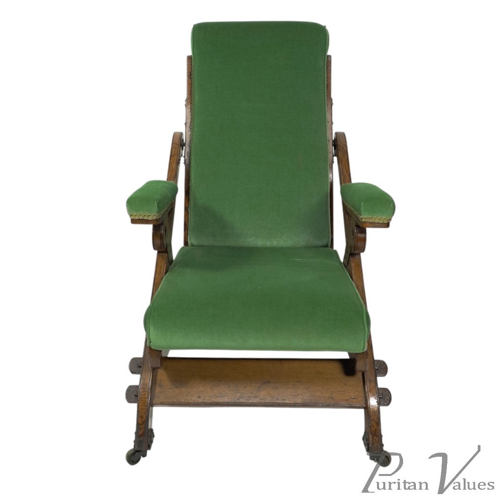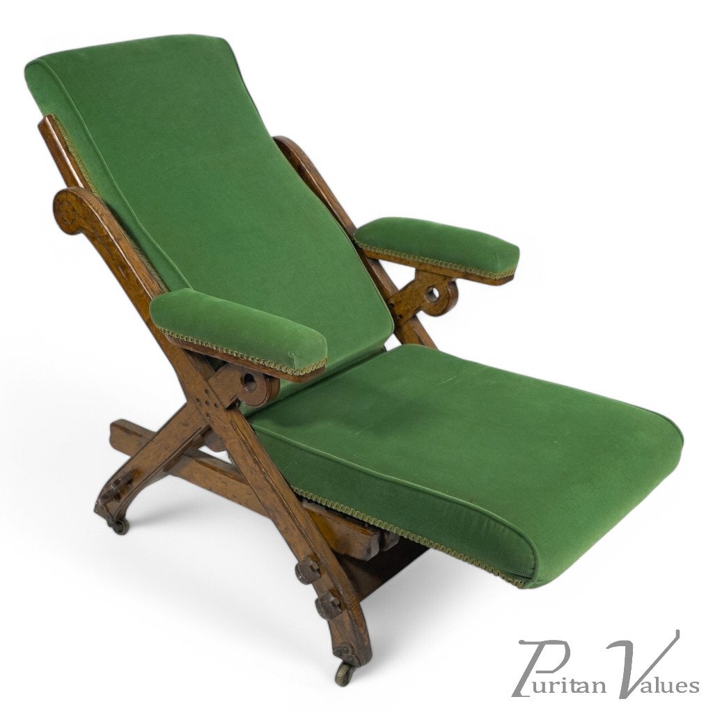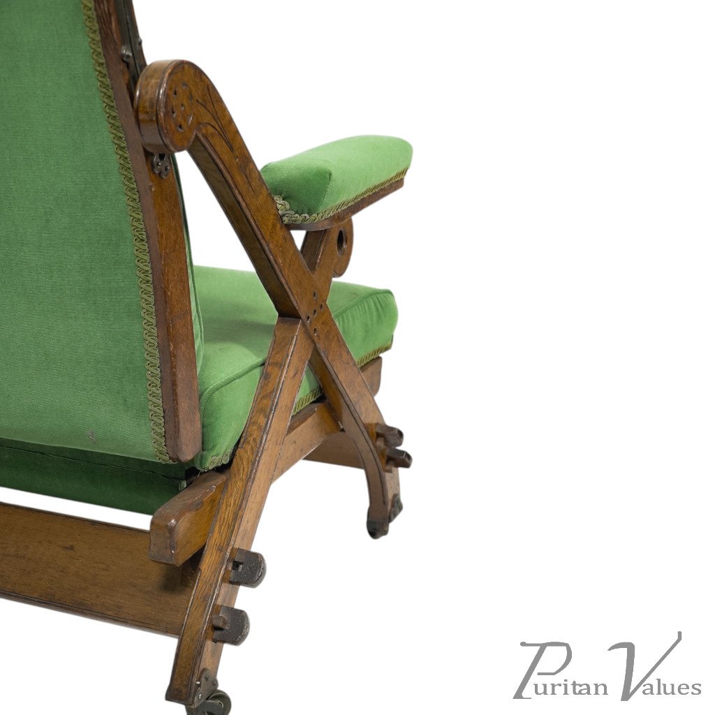 A "New Registered Reclining Chair". A Gothic Revival reclining upholstered armchair, with pegged oak frame and original casters. The brass mechanism is in great shape and still works effortlessly.