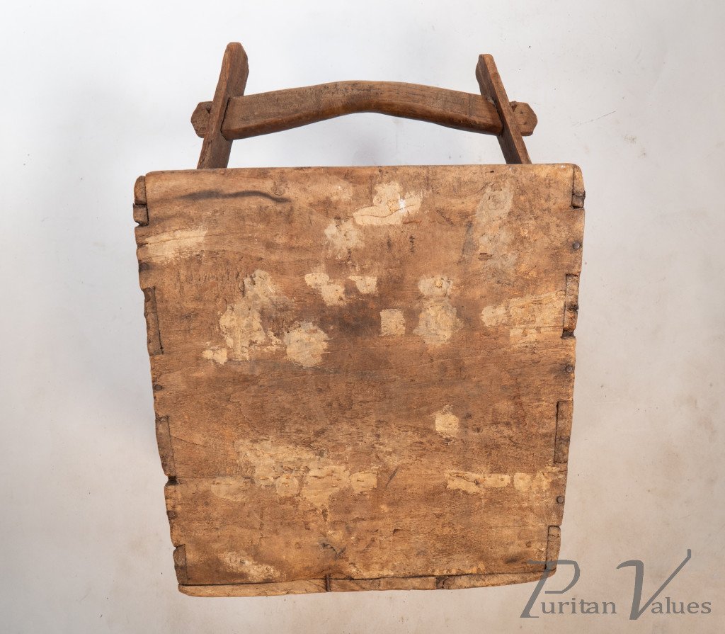 with through pegged joints to the handle uniting the carrying straps, which were bent into place when the wood was green when inserting the shaped handle and peg joints.